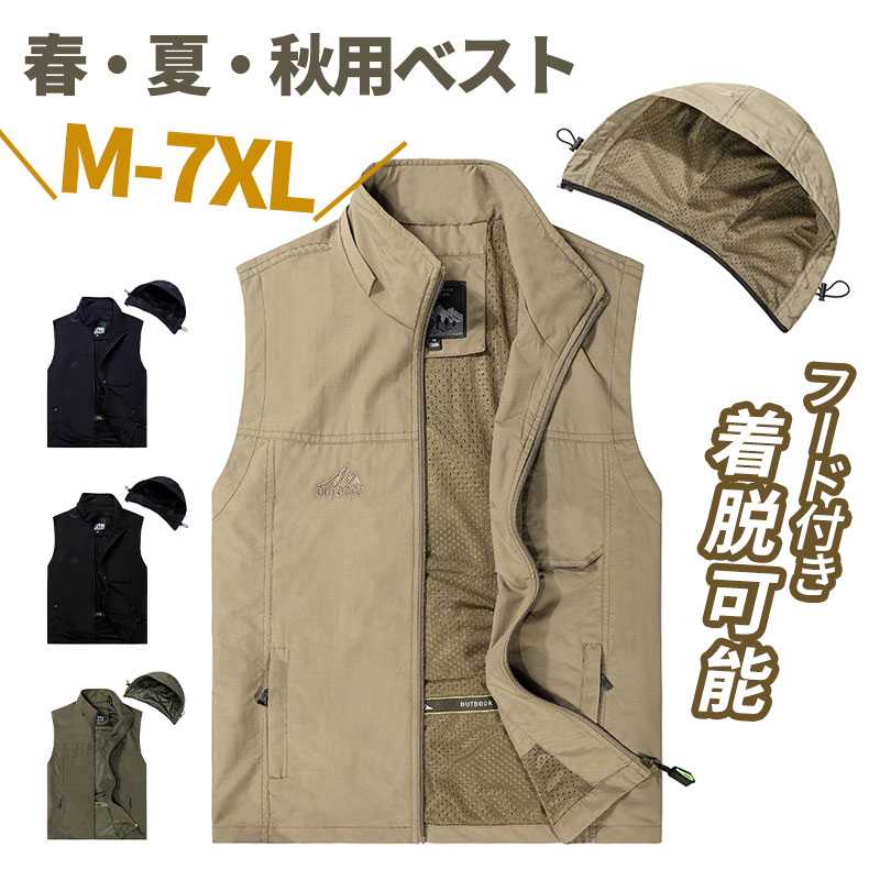 ストレッチ素材で着やすいフード付きベストパーカー上質の良い素材を採用する。通気性が良く、速乾性・柔軟性にも優れています。手軽い着ることができるライトな着心地が魅力。前開きでカーディガン感覚で気軽に羽織れるのも嬉しいポイント、季節や用途を問わず万能に使えるアイテムです。重ね着を楽しめるシンプルなデザインに、色違いで揃えたいなカラーをご用意。釣りはもちろん、ウオーキング、登山、撮影、散歩、作業、キャンプ、遠足 、旅行などの幅広いなどのアウトドアシーンにお使いいただきます サイズM L XL 2XL 3XL 4XLサイズについての説明M着丈67バスト110肩幅51おすすめ体重40-58KGL着丈69バスト114肩幅52おすすめ体重58-68KGXL着丈71バスト118肩幅53おすすめ体重68-83KG2XL着丈73バスト122肩幅54おすすめ体重83-100KG3XL着丈75バスト136肩幅55おすすめ体重100-125KG4XL着丈77バスト150肩幅56おすすめ体重125-150KG※サイズは平置き実寸になります。サイズ表の実寸法は商品によって1-3cm程度の誤差がある場合がございます素材ポリエステル色ベージュ ブラック備考サイズ詳細等の測り方はスタッフ間で統一、徹底はしておりますが、実寸は商品によって若干の誤差(1cm〜3cm )がある場合がございますので、予めご了承ください。商品の色は、撮影時の光や、お客様のモニターの色具合などにより、実際の商品と異なる場合がございます。あらかじめ、ご了承ください。▼色味の強い製品によっては他の衣類などに色移りする場合もございますので、速やかに(脱水、乾燥等)するようにお願いいたします。▼▼生地の特性上、やや匂いが強く感じられるものもございます。数日のご使用や陰干しなどで気になる匂いはほとんど感じられなくなります。メンズ ライトアウター 春夏 秋 パー メンズファッション 豊富 ベージュ ブラック M L XL 2XL 3XL 4XL メンズ ライトアウター 春夏 秋 パーカー ベスト ノースリーブ トップス カジュアル アウター スウェットパーカー ジップアップ 薄手 ジレベスト チョッキ カジュアルベスト 1,800 ~