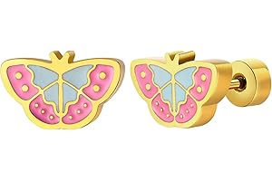 Rockyu Allure イヤリング キッズ ゴールド 蝶々デザイン ステンレススチール エナメル加工 かわいい ピンクブルー 2g 誕生日 ギフト