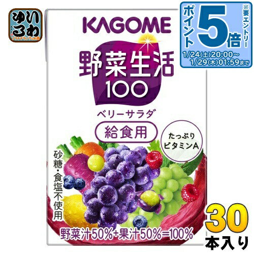 > こちらの商品の単品・まとめ買いはこちら【一個あたり 87円(税込)】【賞味期間】製造後9ヶ月【商品説明】14種類の野菜と4種類のフルーツをブレンドしたおいしさを楽しみながら、たっぷりビタミンAが摂れる、野菜汁50%+果汁50%=100%の野菜・果実ミックスジュースです。 アレルギーに配慮し、原材料を選定しました。 常温保存可能で取り扱いやすく、お年寄りからお子様まで飲みきりやすい100mlサイズです。 【名称および品名】野菜・果実ミックスジュース【エネルギー】1本/100mlあたり41kcal【栄養成分】タンパク質: 0.3g 、脂質: 0g 、炭水化物:10.1g、ナトリウム:0〜64mg、食塩相当量: 0〜0.2g【原材料】野菜(にんじん(輸入又は国産(5%未満))、ケール、ほうれん草、アスパラガス、クレソン、パセリ、かぼちゃ、レタス、キャベツ、ビート、だいこん、はくさい、たまねぎ、セロリ)、果実(ぶどう、レモン、ラズベリー、ブルーベリー)/香料【保存方法】常温【製造者、販売者、又は輸入者】カゴメ株式会社※北海道・沖縄県・離島(一部)へのお届けは決済時に送料無料となっていても追加送料が必要です。 (コカ・コーラ直送を除く)北海道1個口 715円(税込)、沖縄県1個口 2420円(税込)※離島・一部地域は追加送料がかかる場合があります。 追加送料の詳細は注文確定メールにてご案内いたします。 ※本商品はご注文タイミングやご注文内容によっては、購入履歴からのご注文キャンセル、修正を受け付けることができない場合がございます。 変更・修正ができない場合は、メール、お電話にてご連絡をお願い致します。 ■ 法人・団体のお客様 大口購入のご相談承ります ■法人のお客様、各種団体のお客様で、まとまった数量でのご購入をご検討の際は、お気軽にご相談ください。 お客様のご要望に合わせて柔軟に対応させていただきます。 まずはお気軽にお問い合わせフォームよりご連絡ください。 送料無料 健康飲料 フルーツ やさい 小容量 野菜生活 カゴメ かごめ ミックスジュース じゅーす 果汁 果実 ビタミン ポリフェノール ビタミン ベリー 紫 むらさき 健康 美容 こども 常温保存可能 甘味料不使用 食塩不使用 やさいせいかつ ケース まとめ買い セット 子供用 幼児用 4901306010167 カゴメ 野菜生活100 ベリーサラダ 給食用 100ml 紙パック 30本入 野菜ジュース 紫の野菜と果実 砂糖不使用 2,592 ~
