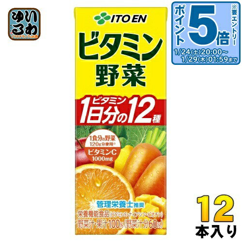 ●12種類のビタミンが1日分補給できる栄養機能食品の野菜・果汁100%飲料。 ●ビタミンCをはじめ、ビタミンE、ナイアシン、ビオチンなど計12種類のビタミンがそれぞれ1日分補給できる野菜飲料です。 ●栄養機能食品(ビタミンE、ナイアシン、ビオチン) ●にんじん主体の21種類の野菜に、オレンジなど7種類の果実をミックスし、ゴクゴク飲めるすっきりした味わい。 ●紙パックの野菜ジュースをお探しの方にもおすすめです。 ■栄養成分(栄養機能食品):ビタミンE、ナイアシン、ビオチン ■保健機能食品表示:ビタミンEは、抗酸化作用により、体内の脂質を酸化から守り、細胞の健康維持を助ける栄養素です。 ナイアシンは、皮膚や粘膜の健康維持を助ける栄養素です。 ビオチンは、皮膚や粘膜の健康維持を助ける栄養素です。 ■基準値に占める割合:1日当たりの栄養素等表示基準値2015(18歳以上、基準熱量2200kcal)に占める割合:ビタミンE 126%、ナイアシン 100%、ビオチン 100% ■1日あたりの摂取目安量:1日当たり1本(200ml)を目安にお飲みください。 ●本品は「りんご」「オレンジ」「もも」を使用しています。 アレルギーの方はお控えください。 原材料・成分 野菜(にんじん、トマト、赤ピーマン、かぼちゃ、大根、きゅうり、インゲン豆、ケール、レタス、ピーマン、アスパラガス、ブロッコリー、セロリ、あしたば、小松菜、パセリ、クレソン、キャベツ、ラディッシュ、ほうれん草、三つ葉)、果実(りんご、オレンジ、うんしゅうみかん、マンゴー、もも、レモン、アセロラ)/V.C、香料、ナイアシン、V.E、パントテン酸Ca、V.B1、V.B6、V.B2、V.A、葉酸、ビオチン、V.D、V.B12店舗・商品概要:豊富な品揃えをスピーディにお届けする快適通販ショップ、養鼈園(ヨウベツエン)楽天市場店では、まとめ買い、大量買い、ケース買い、箱買い、災害の防災備蓄などにも役立つ飲料のほか、おしゃれで可愛いインテリア、オシャレな日用品など、たくさんの商品を取り揃えております。 プレゼントやギフト、プチギフトや各種内祝い、お祝い、ちょっとしたプレゼントや会合、クリスマスのパーティー、お中元、お歳暮、母の日、父の日、お取り寄せして自分用として、オフィス用、会社用としてなどにもぴったりなアイテムもございますので、ぜひお買い物をお楽しみください。