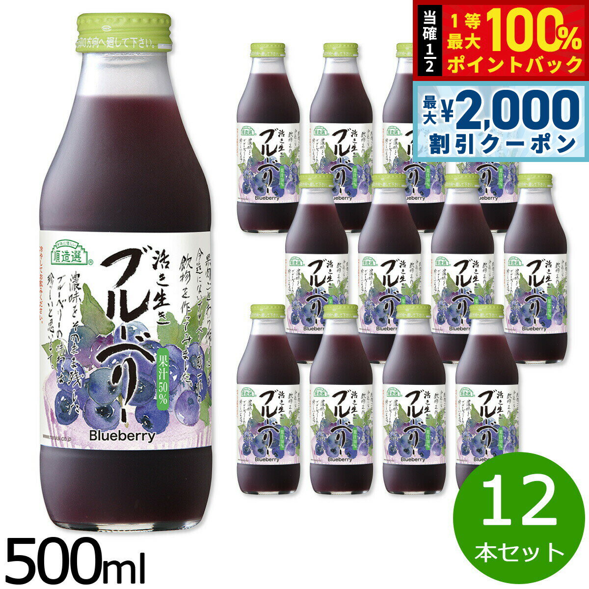 【25日限定!2000円OFFクーポン&抽選で最大10000ptバック】順造選 ブルーベリー 500ml×12本セット ジュース ストレート 果汁50 無添加 無香料 瓶 日本製 粗搾り 果肉入り 【送料無料】 10,368 ~