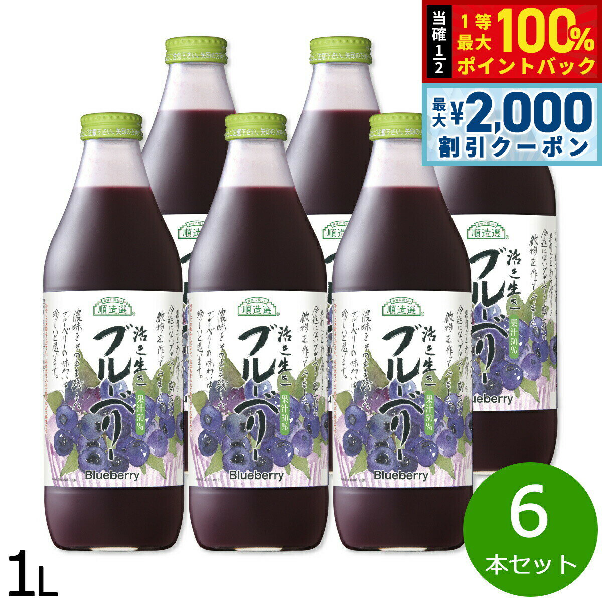 【25日限定!2000円OFFクーポン&抽選で最大10000ptバック】順造選 ブルーベリー 1L×6本セット ジュース ストレート 果汁50 無添加 無香料 瓶 日本製 粗搾り 果肉入り 【送料無料】 9,720 ~