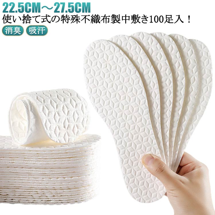22.5cm?27.5cm使い捨て式の特殊不織布製中敷き100足入!不快な汗を吸収し靴中をさわやかに保つ!毎日取り替えて清潔さわやか、夏のムレやニオイ対策に軽量・薄型でパンプスやビジネスユーズにも使いやすい靴のサイズに合わせてハサミでカットしてご使用ください サイズ (35)22.5cm (36)23.0cm (37)23.5cm (38)24.0cm (39)24.5cm (40)25.0cm (41)25.5cm (42)26.0cm (43)26.5cm (44)27.0cm (45)27.5cm サイズについての説明 (35)22.5cm (36)23.0cm (37)23.5cm (38)24.0cm (39)24.5cm (40)25.0cm (41)25.5cm (42)26.0cm (43)26.5cm (44)27.0cm (45)27.5cm 素材 木材パルプ 色 100足入り 備考 ●サイズ詳細等の測り方はスタッフ間で統一、徹底はしておりますが、実寸は商品によって若干の誤差(1cm?3cm )がある場合がございますので、予めご了承ください。 ●製造ロットにより、細部形状の違いや、同色でも色味に多少の誤差が生じます。 ●パッケージは改良のため予告なく仕様を変更する場合があります。 ▼商品の色は、撮影時の光や、お客様のモニターの色具合などにより、実際の商品と異なる場合がございます。 あらかじめ、ご了承ください。 ▼生地の特性上、やや匂いが強く感じられるものもございます。 数日のご使用や陰干しなどで気になる匂いはほとんど感じられなくなります。 ▼同じ商品でも生産時期により形やサイズ、カラーに多少の誤差が生じる場合もございます。 ▼他店舗でも在庫を共有して販売をしている為、受注後欠品となる場合もございます。 予め、ご了承お願い申し上げます。 ▼出荷前に全て検品を行っておりますが、万が一商品に不具合があった場合は、お問い合わせフォームまたはメールよりご連絡頂けます様お願い申し上げます。 速やかに対応致しますのでご安心ください。