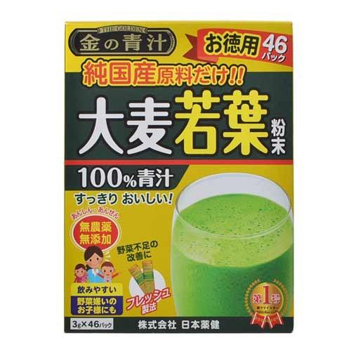 ※ご注意ください!!ご注文いただいてからのお取り寄せとなります。 ●商品の改訂により商品のデザイン、パッケージに記載されている内容と異なる場合があります。 【商品の特徴】契約農家の手で無農薬栽培された国産の大麦若葉を惜しみなく100%配合!副原料・香料・添加物・防腐剤などは一切無添加!鮮度にこだわり、収穫から24時間内に加工。 さらに鮮度を保持するため、「フレッシュパック方式」を採用。 お抹茶風味の味でありながら、青汁特有の青臭さがないスッキリとした味。 食物繊維、ビタミン、ミネラルなどいろんな栄養素がたっぷり!野菜不足の改善におすすめです。 【商品区分】健康食品 【原材料名】 大麦若葉粉末(国内製造) 【栄養成分表示】 1パック(3g)当たり エネルギー・・・9.3kcal たんぱく質・・・0.9g 脂質・・・0.2g −飽和脂肪酸・・・0.02g −トランス脂肪酸・・・0g コレステロール・・・0mg 炭水化物・・・1.5g −糖質・・・0.2g −食物繊維・・・1.3g 食塩相当量・・・0.002g ビタミンB1・・・0.01mg ビタミンB2・・・0.04mg ビタミンB6・・・0.02mg ビタミンC・・・1.1mg ビタミンE・・・0.2mg ビタミンK・・・81μg ビオチン・・・0.7μg 葉酸・・・16μg ナイアシン・・・0.1mg パントテン酸・・・0.04mg カルシウム・・・12mg マグネシウム・・・5mg カリウム・・・72mg リン・・・12mg 亜鉛・・・0.1mg 銅・・・0.03mg 鉄・・・0.3mg マンガン・・・0.08mg クロム・・・2μg β-カロテン・・・10〜1320μg アスパラギン酸・・・56mg アラニン・・・38mg アルギニン・・・33mg イソロイシン・・・26mg グリシン・・・32mg グルタミン酸・・・68mg シスチン・・・8mg スレオニン・・・28mg セリン・・・25mg チロシン・・・18mg トリプトファン・・・12mg バリン・・・35mg ヒスチジン・・・14mg フェニルアラニン・・・31mg プロリン・・・29mg メチオニン・・・12mg リジン・・・34mg ロイシン・・・49mg タンニン・・・18mg カフェイン(無水)・・・検出せず SOD様活性・・・19〜930unit 総クロロフィル・・・25mg ポリフェノール・・・21mg 【内容量】46包×1【製造あるいは販売者】株式会社日本薬健0800-888-0070受付時間 月曜日〜金曜日 9:30〜17:00(土、日、祝日を除く)【広告文責】 株式会社富士薬品 0120-51-2289 金の青汁 純国産大麦若葉100%粉末 46パック 1,490 ~