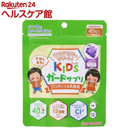 お店TOP>健康食品>ローヤルゼリー・プロポリス>プロポリス類>プロポリス 粒・カプセル>KIDSガードサプリ プロポリス&乳酸菌 (40粒)【KIDSガードサプリ プロポリス&乳酸菌の商品詳細】●プロポリスや有胞子性乳酸菌、ビタミン類に加え、特許成分のお口に働くオリゴ糖CIデキストランを配合した、ぶどう味が美味しいチュアブルタイプの子供向けサプリメントです。 【召し上がり方】1日5粒を目安に、少しずつよく噛んでお召し上がりください。 【品名・名称】プロポリスエキス含有食品【KIDSガードサプリ プロポリス&乳酸菌の原材料】ぶどう糖(国内製造)、グレープ果汁パウダー、有胞子性乳酸菌末、亜鉛含有酵母、環状イソマルトオリゴ糖、プロポリスエキス末/シクロデキストリン、クエン酸、甘味料(ステビア、ラカンカ抽出物)、香料、ショ糖脂肪酸エステル、ビタミンC、抽出ビタミンE、ナイアシン、パントテン酸Ca、ビタミンB1、ビタミンB6、ビタミンB2、ビタミンA、ビタミンD、葉酸、ビタミンB12【栄養成分】5粒当たりエネルギー:10.92kcal、たんぱく質:0.02g、脂質:0.03g、炭水化物:2.66g、食塩相当量:0.0004g、VA:77.4μg、VB1:0.12mg、VB2:0.11mg、VB6:0.12mg、VB12:0.24μg、VC:8.88mg、VD:13.11μg、VE:0.54mg、葉酸:23.4μg、パントテン酸:0.46mg、ナイアシン:1.2mg、亜鉛:1.77mg【アレルギー物質】なし【規格概要】商品サイズ:120mm×100mm×10mm【保存方法】高温多湿及び直射日光を避けて保存してください。 【注意事項】・お子様の手の届かないところに保管してください。 ・原材料をご確認の上、食物アレルギーのある方はお避けください。 ・体質に合わない場合は摂取を中止してください。 ・開封後はお早めにお召し上がりください。 ・風味や色が変化したり、成分由来の細かい点が見られる場合がありますが、品質に問題ございません。 ※小さなお子様がお召し上がる際には、のどに詰まらないようにご注意ください。 ※チュアブルタイプのため乳歯が生え揃ってからの摂取をおすすめします。 ※乾燥剤はお召し上がりにならないようにご注意ください。 【原産国】日本【発売元、製造元、輸入元又は販売元】森川健康堂リニューアルに伴い、パッケージ・内容等予告なく変更する場合がございます。 予めご了承ください。 森川健康堂151-0053 東京都渋谷区代々木1-36-10120-01-8835広告文責:楽天グループ株式会社電話:050-5577-5042[動物性サプリメント] KIDSガードサプリ プロポリス&乳酸菌(40粒) 1,620 ~
