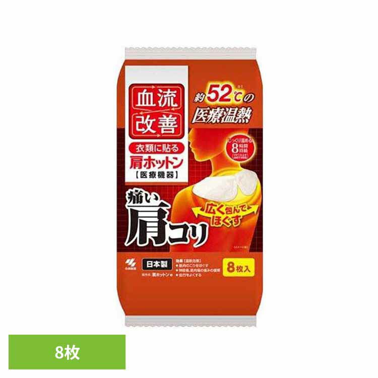 温熱により血流改善し、肩などのコリをほぐします。 首・肩の痛みに合わせて角度を調整できるので、首・肩にピッタリとフィットします。 両肩のコリを1枚でほぐす幅26cmのワイドサイズです。 約52℃※1の温熱です。 コリ改善に適した温度が8時間持続※2します。 ※1:温熱シートの発熱温度(JIS S4100に基づいて測定)※2:40℃以上の発熱が持続する時間※リニューアルに伴い、パッケージ・内容等予告なく変更する場合がございます。 予めご了承ください。 ●商品サイズ(cm)幅約12.5×奥行約7×高さ約17.5●商品重量約0.431kg●医療機器届出番号:28B3X10011000045(1)使用直前に袋から温熱シートを取り出す。 (2)温熱シート中央下部のつながっている部分を手で切り離す。 (上部のつながっている部分は切り離さない。 )(3)はく離シートをはがす。 (4)肌に直接触れないよう、もまずに衣類のエリに合わせて温熱シートの角度を調整して衣類に貼る。 【使用方法等に関する使用上の注意】 就寝時やふとんの中で使用しない。 本品を使用した状態でさらに上から押さえつけたり、長時間圧迫しない。 コタツや電気カーペットその他暖房器具と併用しない。 熱いと感じたときに、すぐにはがせない状態での使用はさける。 運動時には使用しない。 使用上の注意1.使用注意(次の方は慎重に使用すること)(1)皮フの弱い方 [やけどになりやすい](2)高齢者 [生理機能が低下していることが多く、やけどすることがある]2.重要な基本的注意1)次の方は使用前に医師または薬剤師に相談する。 (1)今までに薬や化粧品などによるアレルギー症状(例えば発疹、発赤、かゆみ、かぶれなど)をおこしたことがある方(2)糖尿病など、温感や血行に障がいをお持ちの方(3)妊娠中の方(4)貼り薬や塗り薬を使用する方2)肌に赤み、かゆみ、痛みなどのやけどの症状がでたときはすぐに使用を中止し、皮フ科医等に相談する。 3)使用中の注意事項(1)低温やけど防止のための注意低温やけどは、体温より高い温度の発熱体を長時間当てていると紅斑、水疱等の症状をおこすやけどをいう。 なお、自覚症状をともなわないで低温やけどになる場合もあるので注意する。 (2)熱いと感じたときや異常が認められる場合は、すぐにはがす。 禁忌・禁止1.再使用禁止2.肌に直接貼らない3.次の方は使用しない(1)自らの意思ですぐにはがせない方(2)手や足に血行障がいのある方[(1)(2)重度のやけどになることがある]4.次の部位には使用しない(1)粘膜、顔(目のまわりなど)[重度のやけどになることがある](2)湿疹・かぶれ(3)傷口(4)打撲・ねんざ[(2)〜(4)症状が悪化することがある]●商品区分一般医療機器●アレルギー物質なし○広告文責:e-net shop株式会社(03-6706-4521)○メーカー(製造):小林製薬○区分:日本製・一般医療機器(検索用:肩こり 温熱 温活 4901548603691)最強翌日配送対象商品に関するご案内 最強翌日配送対象商品・対象地域に該当する場合は最強翌日配送マークがご注文カゴ近くに表示されます。 最強翌日配送可能なお支払方法は【クレジットカード、代金引換、全額ポイント支払い】のみとなります。 下記の場合は最強翌日配送対象外となります。 ・15点以上ご購入いただいた場合 ・時間指定がある場合 ・ご注文時備考欄にご記入がある場合 ・決済処理にお時間を頂戴する場合 ・郵便番号や住所に誤りがある場合 ・最強翌日配送対象外の商品とご一緒にご注文いただいた場合 ・お届け先住所文字数が40文字以上の場合 血流改善肩ホットン 8枚 肩こり 温熱 温活 1,100 ~