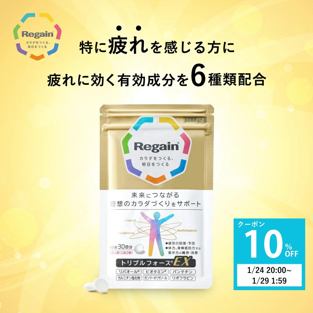 名称リゲイン トリプルフォースEX 成分 [トリプルフォースにも配合]ジクロロ酢酸ジイソプロピルアミン(リバオール)30mg/ベンフォチアミン(ビオタミン:ビタミンB1誘導体)10mg/パンテチン(脱水物として)60mg [新規配合]リボフラビン(ビタミンB2)12mg/カルニチン塩化物50mg/ガンマーオリザノール 10mg 内容量60錠 保存方法直射日光、高温多湿を避けて保存してください。 販売元(メーカー)第一三共ヘルスケアダイレクト株式会社 広告文責第一三共ヘルスケアダイレクト株式会社 原産国日本 商品区分サプリメント・医薬部外品 関連キーワード第一三共ヘルスケア Regain リゲイントリプルフォースEX トリプルフォースEX リゲイントリプルフォース トリプルフォース 糖化 エイジングケア エネルギー代謝 糖代謝 脂質代謝 ATP AGEs対策 疲労予防 疲労改善 疲労回復 睡眠 睡眠不足 寝不足 睡眠障害 眠り ストレス 季節の変わり目 デスクワーク 慢性疲労 蓄積疲労 肉体疲労 中高年疲労 リモートワーク疲れ 働き盛り 主婦 サラリーマン 会社員 集中力 集中力維持 集中力改善 肌荒れ 乾燥 目の疲れ 眼精疲労 目 肩こり 腰痛 首こり 膝痛 滋養強壮 虚弱体質 病中病後 二日酔い 食欲不振 栄養補給 栄養障害 発熱性消耗性疾患 体力維持 健康維持 だるさ だるさ解消 疲れ 飲みやすい 錠剤 1日1回2錠 続けやすい 肝臓 サプリメント 指定医薬部外品 ジクロロ酢酸ジイソプロピルアミン ガンマ?オリザノール ベンチアミン ビタミンB1誘導体 ビタミンB2 ビタミンB6 ニコチン酸アミド パントテン酸カルシウム リバオール ビオタミン パンテチン カルニチン リボフラビン コンドロイチン硫酸エステルナトリウム セルロース ヒドロキシプロピルセルロース ステアリン酸Mg タルク アラビアゴム ゼラチン 白糖 酸化チタン カルナウバロウ カルニチン配合 パンテチン配合 リボフラビン配合 リバオール配合 ビオタミン配合 余分な糖対策 脂質燃焼サポート エネルギーチャージ 父の日 お父さん 父 母の日 お母さん 母 敬老の日 プレゼント ギフト 【リゲイン公式】 疲労回復 トリプルフォースEX [60錠(30日分)]指定医薬部外品 / 日本製 薬用 疲れ 回復 予防 糖 脂肪 脂質 エネルギー代謝 栄養補給 体力維持 集中力 自律神経 第一三共ヘルスケア / ビタミンB2 カルニチン 5,500 ~