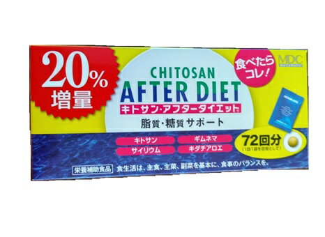 ■ 【 送料・代引き手数料無料 】 お得な5個セット はコチラ>> ■ 【 送料・代引き手数料無料 】 お得な10個セット はコチラ>> ■ 【 送料・代引き手数料無料 】 お得な15個セット はコチラ>>■ 【 送料・代引き手数料無料 】 お得な20個セット はコチラ>> キトサンアフターダイエット 20%増量パック 商品説明 ★ 【数量限定!】 通常60袋入りに、12袋がついて【合計72袋入り】でお買い得!! 分包タイプで持ち運びも便利です☆ キトサンアフターダイエット 感謝記念 お徳用 72包(60包+12包)は、油カンケイに画期的な、天然ダイエット素材「キトサン」に、甘味カンケイのギムネマ・シルベスタ、コンドロイチン硫酸、食物繊維オオバコとエネルギーを発散するトウガラシ末などを、バランス良く配合してパワーアップした最新のダイエット食品です! ※商品番号は実際にお届けしている商品のバーコードとは異なります。 またパッケージがリニュアルしている場合がございますが、その場合は新しいものでお届けいたします。 キトサンアフターダイエットは、実店舗でも人気の、超〜ロングセラー商品です ☆ ※こちらは飲みやすい粒タイプになります。 【キトサンアフターダイエット詳細】 原材料など 名称 キトサンアフターダイエット 原材料名 キチン・キトサン、ギムネマ・シルベスタ末、キダチアロエエキス末、ムコ多糖蛋白複合体、サイリウムハスク、牛骨粉、トウガラシ末、セルロース、乳化剤、クエン酸鉄Na、シナモン香料、ナイアシン、ビタミンB1、ビタミンB2、ビタミンB6、ビタミンB12、ビタミンC、鉄 内容量 300mg×6粒×72袋入り 保存方法 高温多湿、直射日光を避け保存してください。 メーカー 株式会社メタボリック お召し上がり方 1日1〜2袋を目安にお召し上がりください。 広告文責 株式会社プログレシブクルー072-265-0007 区分 日本製・健康食品\ お客様感謝記念!! / ☆数量限定!!【20%増量パック】で 超お買い得に!!! ★なんと72袋入りの大容量!!!画期的な素材 『キトサン』サプリ☆ ★即納【2個セット】【お徳用 72袋入】キトサン アフターダイエット ( お徳用 72袋入り ) ×2個セット 【正規品】 60袋+12袋♪ 分包タイプ ※軽減税率対象品 5,196 ~