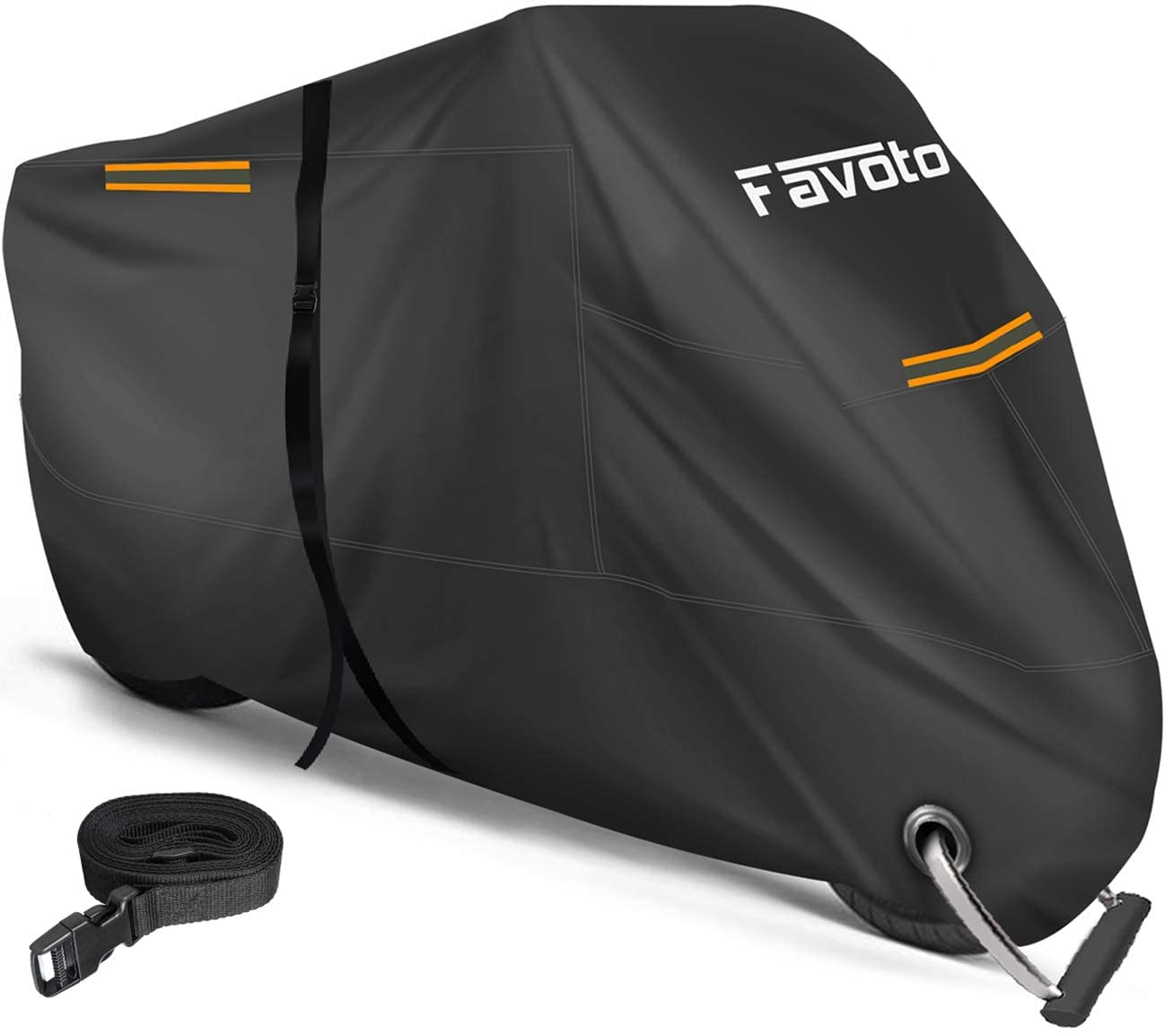 【送料無料】Favoto バイクカバー 防水 紫外線防止 UVカット 高防風 防埃 防雨 防雪 風飛び防止 撥水加工 2.5m防風ベルト付き ワンタッチバックル付き ロック穴付き 反射テープ付き 丈夫 盗難防止 収納バッグ付き バイク車体カバー (220*105*125cm) 4,276 ~