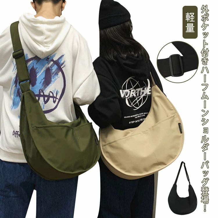 外ポケット付きハーフムーンショルダーバッグ登場! 余計なものを排除した、シンプルスマートなデザイン。 質の高いナイロン素材を採用する。 撥水素材で雨、汚れにも強い! 待望の外ポケット付き!大きな2つの外ポケットで便利に♪ 男女共にお使い頂けるユニセックスデザイン。 長さ調節ベルトありであらゆる方にお使いいただけます。 折りたたんでコンパクトにすれば持ち運びも楽々。 カジュアル×大容量で普段使いにも小旅行バッグにも◎サイズ49*14*40cmサイズについての説明49*14*40cm/重さ約0.3kg ※サイズ表の実寸法は商品によって1-2cm程度の誤差がある場合がございます。 素材ナイロン色ホワイト ベージュ グリーン ブラック備考●サイズ詳細等の測り方はスタッフ間で統一、徹底はしておりますが、実寸は商品によって若干の誤差(1cm?3cm )がある場合がございますので、予めご了承ください。 ●商品の色は、撮影時の光や、お客様のモニターの色具合などにより、実際の商品と異なる場合がございます。 あらかじめ、ご了承ください。 ●製品によっては、生地の特性上、洗濯時に縮む場合がございますので洗濯時はご注意下さいませ。 ▼色味の強い製品によっては他の衣類などに色移りする場合もございますので、速やかに(脱水、乾燥等)するようにお願いいたします。 ▼生地によっては摩擦や汗、雨などで濡れた時は、他の製品に移染する恐れがございますので、着用の際はご注意下さい。 ▼生地の特性上、やや匂いが強く感じられるものもございます。 数日のご使用や陰干しなどで気になる匂いはほとんど感じられなくなります。 外ポケット付きハーフムーンショルダーバッグ登場! 余計なものを排除した、シンプルスマートなデザイン。 質の高いナイロン素材を採用する。 撥水素材で雨、汚れにも強い! 待望の外ポケット付き!大きな2つの外ポケットで便利に♪ 男女共にお使い頂けるユニセックスデザイン。 長さ調節ベルトありであらゆる方にお使いいただけます。 折りたたんでコンパクトにすれば持ち運びも楽々。 カジュアル×大容量で普段使いにも小旅行バッグにも◎サイズ49*14*40cmサイズについての説明49*14*40cm/重さ約0.3kg ※サイズ表の実寸法は商品によって1-2cm程度の誤差がある場合がございます。 素材ナイロン色ホワイト ベージュ グリーン ブラック備考●サイズ詳細等の測り方はスタッフ間で統一、徹底はしておりますが、実寸は商品によって若干の誤差(1cm?3cm )がある場合がございますので、予めご了承ください。 ●商品の色は、撮影時の光や、お客様のモニターの色具合などにより、実際の商品と異なる場合がございます。 あらかじめ、ご了承ください。 ●製品によっては、生地の特性上、洗濯時に縮む場合がございますので洗濯時はご注意下さいませ。 ▼色味の強い製品によっては他の衣類などに色移りする場合もございますので、速やかに(脱水、乾燥等)するようにお願いいたします。 ▼生地によっては摩擦や汗、雨などで濡れた時は、他の製品に移染する恐れがございますので、着用の際はご注意下さい。 ▼生地の特性上、やや匂いが強く感じられるものもございます。 数日のご使用や陰干しなどで気になる匂いはほとんど感じられなくなります。