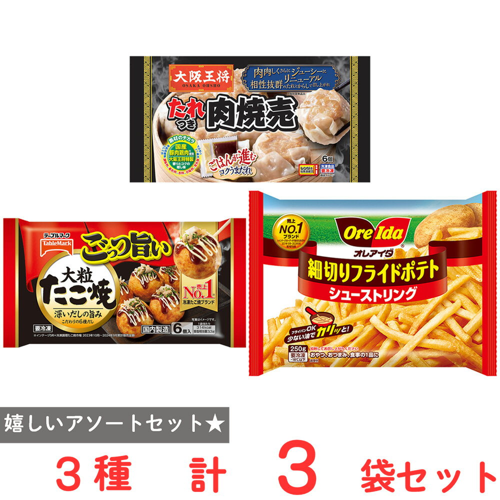 ●商品特徴30年の歴史を持つ総合食品卸会社が運営し、家庭用から業務用まで幅広いニーズにお応えする、Smile Spoonが厳選したアソートセットです!異なる魅力的な商品をお楽しみいただけます。 [冷凍] イートアンドフーズ 大阪王将 たれつき肉焼売 6個入 ×1袋/[冷凍] テーブルマーク ごっつ旨い大粒たこ焼 197g×1個/[冷凍]ハインツ日本 細切りフライドポテト シューストリング 250g×1袋/を詰め合わせております。 ●原材料食品表示情報の掲載内容につきましては、お手元に届きました商品の容器包装の表示を必ずご確認ください。 ●保存方法-18℃以下で保存してください。 ●備考開封後は、お早めにお召し上がりください。 写真はイメージです。 ●アレルゲン アレルギー特定原材料(卵、小麦、乳、えび、かに、そば、落花生、くるみ)等28品目を全てを含む可能性がございます。 お手元に届きました商品の容器包装の表示を必ずご確認ください。 ●原産国または製造国日本●複数購入の際のご注意商品を複数ご購入いただいた場合、配送時にまとめて一つに梱包されることがございます。 個別の梱包をご希望の場合は、1点でのご購入にてお願いいたします。 ショップトップ > カテゴリトップ > 店内カテゴリ一覧 > 食品 > 惣菜・食材 > 中華惣菜・点心 > シュウマイ新着商品はこちら2026/1/23 モランボン ジャン 焼肉の生だれ配合 大きな7,813円2026/1/23 モランボン ジャン 焼肉の生だれ配合 大きな4,507円2026/1/23 モランボン ジャン 焼肉の生だれ配合 大きな3,479円2026/1/23 モランボン ジャン 焼肉の生だれ配合 大きな2,311円2026/1/23 モランボン ジャン 焼肉の生だれ配合 大きな640円2026/1/231位、2位、3位まとめセット3,082円2026/1/22日本製麻 ヨコイ ヨコイのソース レンジ対応 8,639円2026/1/22日本製麻 ヨコイ ヨコイのソース 4人用 509,138円類似商品はこちら1位、2位、3位まとめセット3,082円1位、2位、3位まとめセット2,404円1位、2位、3位まとめセット(マルハニチロ ミ2,481円1位、2位、3位まとめセット2,862円1位、2位、3位まとめセット2,278円 1位、2位、3位まとめセット1,945円 1位、2位、3位まとめセット2,869円 イートアンドフーズ 大阪王将 たれつき肉焼売2,012円 [冷凍]【フローズンアワード2025 おかず<おつまみ>部門受賞】1位、2位、3位まとめセット(イートアンドフーズ テーブルマーク ハインツ日本) 2,197 ~
