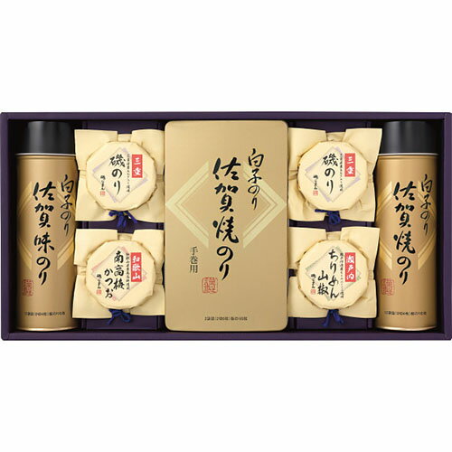■味のり12袋詰(8切4枚)・焼のり2袋詰(2切6枚)・焼のり12袋詰(8切4枚)・三重磯のり125g・瀬戸内ちりめん山椒50g九州佐賀県産ののりと磯じまん佃煮の詰合せ。 ごはんのお供に好適な詰合せです。 白子のり&磯じまん のり・佃煮詰合せ[代引不可] 4,320 ~