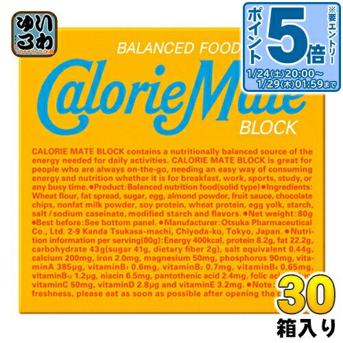 【一個あたり 223円(税込)】【賞味期間】製造後13ヶ月【商品説明】・身体に必要な11種類のビタミン、5種類のミネラル、タンパク質、脂質、糖質を手軽に補給できるバランス栄養食です。 ・世代を問わず人気の高いバニラ味に、チョコレートチップのアクセントがトライアルを促進します。 【名称および品名】菓子【エネルギー】4本あたり400kcal【栄養成分】タンパク質 8.2g、脂質 22.2g、炭水化物 43g(糖質 41g、食物繊維 2g)、食塩相当量 0.44g、カルシウム 200mg、鉄 2.0mg、マグネシウム 50mg、リン 90mg、ビタミンA 385μg、ビタミンB1 0.6mg、ビタミンB2 0.7mg、ビタミンB6 0.65mg、ビタミンB12 1.2μg、ナイアシン 6.5mg、パントテン酸 2.4mg、葉酸 120μg、ビタミンC 50mg、ビタミンD 2.8μg、ビタミンE 3.2mg【原材料】小麦粉(国内製造)、ファットスプレッド(乳成分を含む)、砂糖、卵、アーモンドパウダー、フルーツソース(りんごを含む)、チョコレートチップ、脱脂粉乳、大豆タンパク、小麦タンパク、卵黄、でん粉、食塩/カゼインナトリウム、加工でん粉、香料【保存方法】常温【製造者、販売者、又は輸入者】大塚製薬株式会社【アレルギー特定原材料】卵、乳成分、小麦、大豆、アーモンド、りんご※北海道・沖縄県・離島(一部)へのお届けは決済時に送料無料となっていても追加送料が必要です。 (コカ・コーラ直送を除く)北海道1個口 715円(税込)、沖縄県1個口 2420円(税込)※離島・一部地域は追加送料がかかる場合があります。 追加送料の詳細は注文確定メールにてご案内いたします。 ※本商品はご注文タイミングやご注文内容によっては、購入履歴からのご注文キャンセル、修正を受け付けることができない場合がございます。 変更・修正ができない場合は、メール、お電話にてご連絡をお願い致します。 ■ 法人・団体のお客様 大口購入のご相談承ります ■法人のお客様、各種団体のお客様で、まとまった数量でのご購入をご検討の際は、お気軽にご相談ください。 お客様のご要望に合わせて柔軟に対応させていただきます。 まずはお気軽にお問い合わせフォームよりご連絡ください。 送料無料 お菓子 菓子 小腹満たし バランス栄養食 手軽に栄養補給 携行食 携帯食 非常食 かろりーめいと 4987035648918 〔エントリーでポイント5倍!〕 大塚製薬 カロリーメイトブロック バニラ味 4本 30箱入 バランス栄養食 6,674 ~