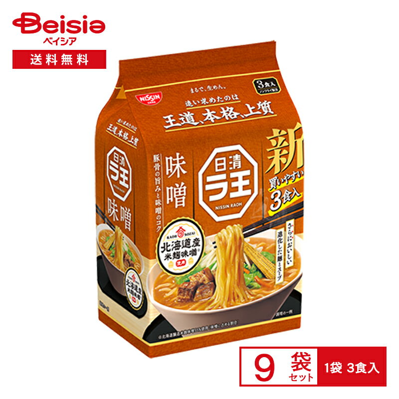 3食になって進化したラ王!さらに美味しくなって新登場!厳選素材には“北海道産米麹味噌”を使用。 北海道産米麹味噌の旨みに、にんにくや生姜といった香味野菜の風味がきいたコク深い味噌ラーメンです。 商品仕様・説明 メーカー名 日清食品 原材料 めん(小麦粉(国内製造)、食塩、植物油脂、チキン調味料)、スープ(みそ、しょうゆ、ポークエキス、香辛料、豚脂、食塩、香味油、ポーク調味油、糖類、酵母エキス、植物油脂、みそ調味油、大豆食物繊維)/加工でん粉、かんすい、調味料(アミノ酸等)、リン酸Ca、カラメル色素、香料、酸化防止剤(ビタミンC、ビタミンE)、カロチノイド色素、香辛料抽出物、ビタミンB2、ビタミンB1、乳化剤、(一部に小麦・卵・乳成分・ごま・大豆・鶏肉・豚肉を含む) 栄養成分 1食(99g)当たりエネルギー322g,たんぱく質8.6g,脂質3.8g,炭水化物63.3g,食塩相当量5.5g アレルギー 小麦,卵,乳,ごま,大豆,鶏肉,豚肉 内容量 3p 【ご注意(免責事項)> 必ずお読み下さい】商品情報には注意を払っておりますが、メーカー都合により予告なくパッケージ、商品名、容量、産地等が変更になる場合がございます。 予めご了承ください。 類似商品はこちら日清 ラ王 柚子しお 279g×3食入)×9パ4,788円日清 ラ王 担々麺 285g×3食入)×9パッ4,788円日清 ラ王 豚骨醤油 300g×3食入)×9パ4,788円日清 カップヌードル シンガポール風ラクサ 83,624円日清 あっさりおいしいカップヌードル 旨辛シー4,160円日清 ラ王 とろ熟味噌 118g×12個4,488円丸美屋 ソフトふりかけ ちりめん山椒 28g×10,800円丸美屋 ごましおスティック 39g×80袋 |10,880円日清 お椀で食べるカップヌードル シーフード 3,510円Powered by EC-UP2026/01/23 更新 【ポイント5倍!|1/24-2/11 1:59まで】日清 ラ王 味噌 297g(99g(めん80g)×3食入)×9パック | まとめ買い 業務用 送料無用 ケース販売 4,788 ~