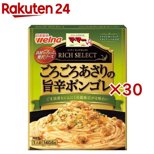 お店TOP>フード>加工食品・惣菜>レトルト食品>パスタソース(レトルト)>マ・マー リッチセレクト ごろごろあさりの旨辛ボンゴレ 1人前 (140.6g×30セット)【マ・マー リッチセレクト ごろごろあさりの旨辛ボンゴレ 1人前の商品詳細】●<具材ごろっと、贅沢ソース>。 ごろごろとしたあさりの旨みの中に広がるごま油の香り、唐辛子とピリッときかせた、にんにくの風味豊かな味わい。 【品名・名称】パスタソース【マ・マー リッチセレクト ごろごろあさりの旨辛ボンゴレ 1人前の原材料】★パスタソースあさり、植物油脂、しょうゆ、しょうがペースト、にんにくペースト、食塩、あさりエキス、でん粉、ローストガーリック、魚介エキス、食酢、香辛料/増粘剤(加工でん粉)、調味料(アミノ酸等)、乳化剤、(一部に小麦・ごま・大豆・りんごを含む)★トッピングフライドガーリック、イタリアンパセリ、(一部に大豆を含む)【栄養成分】1人前(140.6g)当たり エネルギー118kcal、たんぱく質4.0g、脂質8.8g、炭水化物5.7g、食塩相当量3.0g【アレルギー物質】小麦・ごま・大豆・りんご【保存方法】高温多湿の場所、直射日光を避けて保存してください。 【ブランド】マ・マー【発売元、製造元、輸入元又は販売元】日清製粉ウェルナ※説明文は単品の内容です。 リニューアルに伴い、パッケージ・内容等予告なく変更する場合がございます。 予めご了承ください。 ・単品JAN:4902110264654日清製粉ウェルナ101-8441 東京都千代田区神田錦町1-250120-244-157広告文責:楽天グループ株式会社電話:050-5577-5043[調味料/ブランド:マ・マー/] マ・マー リッチセレクト ごろごろあさりの旨辛ボンゴレ 1人前(140.6g×30セット)【マ・マー】 8,429 ~
