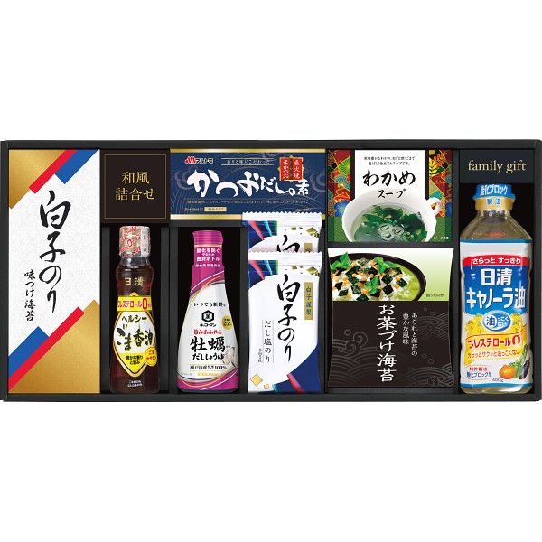 人気のキッコーマンしぼりたて生しょうゆとバラエティ豊かな和の詰合せです。 〈br〉●商品内容:有明海産味付け海苔(8切4枚)×3、永谷園お茶づけ海苔(4.7g×2)・永谷園お吸いもの松茸風味(2.3g×2・粉末)・鰹節削り(1.5g×4)・のり玉子ふりかけ(4.5g×2)・キッコーマンしぼりたて生しょうゆ200ml・日清キャノーラ油400g×各1〈br〉●箱サイズ:42.5×25×7cm〈br〉●箱重量:1.202:kg〈br〉●包装種別区分:化粧箱入〈br〉●宅配冷蔵区分:常温〈br〉●賞味期間:390日〈br〉●アレルギー表示:卵 乳成分 小麦 大豆 ごま 〈br〉こんなご用途にご使用できます 出産内祝い 結婚内祝い 結婚引き出物 結婚引出物 結婚御祝い 快気祝い 快気内祝 全快祝い 全快内祝 新築祝い 上棟祝 新築内祝 成人祝い 成人内祝 入学祝い 進学祝 入学内祝 入園祝い 入園祝 卒園祝 卒業内祝 入園内祝 進学内祝 初節句内祝い 初節句 七五三 七五三内祝 就職祝い 就職内祝 退職祝い 敬老祝い 香典返し 満中陰志 法事・法要引き物 父の日 母の日 お誕生日祝い プレゼント 還暦祝い 長寿祝 初老祝 還暦祝 古稀祝 喜寿祝 傘寿祝 米寿祝 卒寿祝 白寿祝 長寿祝お返し 退職記念 記念日 お中元 お歳暮 ゴルフコンペ ボーリング大会 賞品 記念品 法人 大口 ノベルティメーカー希望小売価格はメーカーカタログに基づいて掲載しています。 ※商品はご注文後の手配となりますので完売の際はご容赦ください。