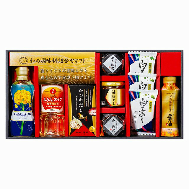 ●セット内容/白子だし塩のり(8切5枚)×3、のり佃煮(80g)×2、鮭ほぐし(50g)・かつおだし(4g×8袋)・伊賀越 天然醸造醤油(200ml)・昭和 キャノーラ油(300g)・日の出 割烹みりんタイプ(400ml)×各1●箱サイズ/24.5×47×7.5cm●賞味期間/常温1年●アレルゲン/乳・小麦●重量/2.2kgミシュランが認める日本料理店「神谷」監修の味をご家庭でもお楽しみください 和の調味料詰合せ 5,076 ~