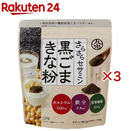 お店TOP>健康食品>植物由来サプリメント>穀類・豆類>黒ごまきなこ>九鬼 さらさらセサミン黒ごまきな粉 (120g×3セット)【九鬼 さらさらセサミン黒ごまきな粉の商品詳細】●特許取得の微粉砕黒ごまパウダーを使用し、大さじ1杯(7g)に黒ごまを約3000粒使用した黒ごまがメインの黒ごまきな粉です。 【品名・名称】ごま加工品【九鬼 さらさらセサミン黒ごまきな粉の原材料】黒いりごま(国内製造)、きなこ(大豆(国産))、セサミン【栄養成分】100g当たりエネルギー:437kcal、たんぱく質:42.7g、脂質:24.0g、炭水化物:22.3g(糖質:2.9g、食物繊維:19.4g)、食塩相当量:0.01g、カルシウム:1320mg、鉄:9.8mg、セサミン:201mg、大豆イソフラボン:45mg【アレルギー物質】ごま、大豆【保存方法】直射日光・高温多湿を避け、常温で保存。 【ブランド】九鬼【発売元、製造元、輸入元又は販売元】九鬼産業※説明文は単品の内容です。 リニューアルに伴い、パッケージ・内容等予告なく変更する場合がございます。 予めご了承ください。 ・単品JAN:4972370503091九鬼産業三重県四日市市尾上町11番地0120-50-1158広告文責:楽天グループ株式会社電話:050-5577-5043[粉類/ブランド:九鬼/] 九鬼 さらさらセサミン黒ごまきな粉(120g×3セット)【九鬼】 1,090 ~