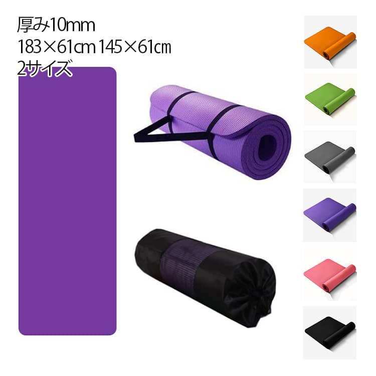 ストレッチやトレーニングに最適なヨガマット【厚み10mm】【183*61cm?145*61cm】2サイズシンプルなデザインのヨガマット。 滑りにくく使いやすい!体を守ってくれる厚さ10mmの大判ヨガマット。 厚めでクッション性に優れており、床の硬さや冷たさを軽減してくれます。 使いやすいサイズ感と程よいクッション性で、ストレッチやトレーニングに最適です。 ゴムバンドとケースが付属しているので収納しやすく、持ち運びがしやすいのも嬉しいポイントです。 ヨガはもちろん、自宅でのトレーニングやピラティス、フィットネスジムでも大活躍の1枚です! サイズ 183*61cm(ケース/バンド付き) 150*61cm(ケース/バンド付き) サイズについての説明 183*61cm(ケース/バンド付き) 150*61cm(ケース/バンド付き) 素材 NBR 色 パープル ピンク ブルー ブラック グリーン オレンジ グレー 備考 ●サイズ詳細等の測り方はスタッフ間で統一、徹底はしておりますが、実寸は商品によって若干の誤差(1cm?3cm )がある場合がございますので、予めご了承ください。 ●製造ロットにより、細部形状の違いや、同色でも色味に多少の誤差が生じます。 ●パッケージは改良のため予告なく仕様を変更する場合があります。 ▼商品の色は、撮影時の光や、お客様のモニターの色具合などにより、実際の商品と異なる場合がございます。 あらかじめ、ご了承ください。 ▼生地の特性上、やや匂いが強く感じられるものもございます。 数日のご使用や陰干しなどで気になる匂いはほとんど感じられなくなります。 ▼同じ商品でも生産時期により形やサイズ、カラーに多少の誤差が生じる場合もございます。 ▼他店舗でも在庫を共有して販売をしている為、受注後欠品となる場合もございます。 予め、ご了承お願い申し上げます。 ▼出荷前に全て検品を行っておりますが、万が一商品に不具合があった場合は、お問い合わせフォームまたはメールよりご連絡頂けます様お願い申し上げます。 速やかに対応致しますのでご安心ください。