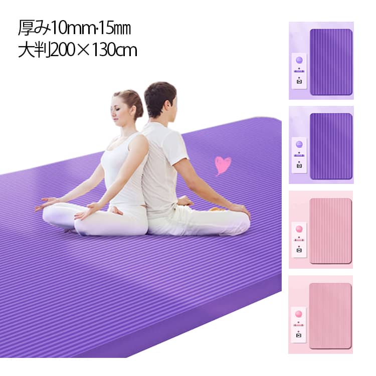 ストレッチやトレーニングに最適なヨガマット【厚み10mm?15mm】【大判200*130cm】シンプルなデザインのヨガマット。 滑りにくく使いやすい!体を守ってくれる厚さ10mmの大判ヨガマット。 厚めでクッション性に優れており、床の硬さや冷たさを軽減してくれます。 使いやすいサイズ感と程よいクッション性で、ストレッチやトレーニングに最適です。 ゴムバンドが付属しているので収納しやすく、持ち運びがしやすいのも嬉しいポイントです。 ヨガはもちろん、自宅でのトレーニングやピラティス、フィットネスジムでも大活躍の1枚です! サイズ 200*130cm(バンド付き) サイズについての説明 200*130cm(バンド付き) 素材 NBR 色 パープル(10mm) ピンク(10mm) パープル(15mm) ピンク(15mm) 備考 ●サイズ詳細等の測り方はスタッフ間で統一、徹底はしておりますが、実寸は商品によって若干の誤差(1cm?3cm )がある場合がございますので、予めご了承ください。 ●製造ロットにより、細部形状の違いや、同色でも色味に多少の誤差が生じます。 ●パッケージは改良のため予告なく仕様を変更する場合があります。 ▼商品の色は、撮影時の光や、お客様のモニターの色具合などにより、実際の商品と異なる場合がございます。 あらかじめ、ご了承ください。 ▼生地の特性上、やや匂いが強く感じられるものもございます。 数日のご使用や陰干しなどで気になる匂いはほとんど感じられなくなります。 ▼同じ商品でも生産時期により形やサイズ、カラーに多少の誤差が生じる場合もございます。 ▼他店舗でも在庫を共有して販売をしている為、受注後欠品となる場合もございます。 予め、ご了承お願い申し上げます。 ▼出荷前に全て検品を行っておりますが、万が一商品に不具合があった場合は、お問い合わせフォームまたはメールよりご連絡頂けます様お願い申し上げます。 速やかに対応致しますのでご安心ください。