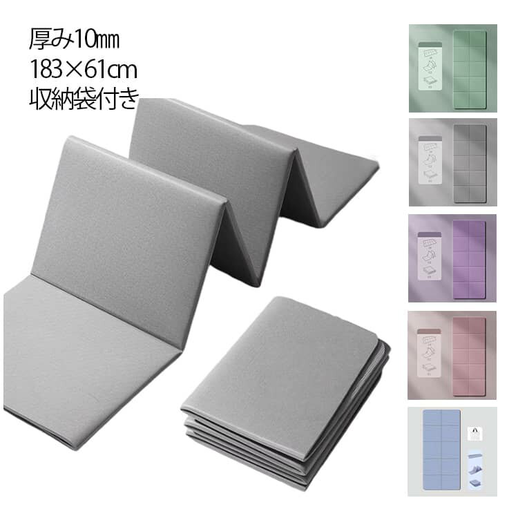 ストレッチやトレーニングに最適な折りたたみヨガマット【厚み10mm】【183*61cm】【収納袋付き】厚さ10mm!クッション性も◎優しい弾力のTPEを採用!クッション性がありひざやひじをついても痛くなりにくく快適にトレーニングが行えます。 汗や水分が染み込みにくい素材で濡れてもさっと拭けて清潔に使えます。 凸凹感あるエンボス加工を施した表面が手足に張り付きにくく、さらりとした使用感です。 裏地は滑り止め加工がされているので安心して使用できます。 コンパクトに折りたためて持ち運び&収納に便利!収納袋付き。 約183cm×61cmのゆったりサイズなので様々なヨガのポーズなどトレーニングだけでなくお昼寝にも最適!トレーニングマシンの下にひけば床の傷つきの防止にも使え、また厚みのあるマットによって騒音を軽減してくれます。 サイズ 10mm サイズについての説明 183*61cm(収納袋付き) 素材 TPE 色 パープル(収納袋付き) ピンク(収納袋付き) グレー(収納袋付き) グリーン(収納袋付き) ブルー(収納袋付き) 備考 ●サイズ詳細等の測り方はスタッフ間で統一、徹底はしておりますが、実寸は商品によって若干の誤差(1cm?3cm )がある場合がございますので、予めご了承ください。 ●製造ロットにより、細部形状の違いや、同色でも色味に多少の誤差が生じます。 ●パッケージは改良のため予告なく仕様を変更する場合があります。 ▼商品の色は、撮影時の光や、お客様のモニターの色具合などにより、実際の商品と異なる場合がございます。 あらかじめ、ご了承ください。 ▼生地の特性上、やや匂いが強く感じられるものもございます。 数日のご使用や陰干しなどで気になる匂いはほとんど感じられなくなります。 ▼同じ商品でも生産時期により形やサイズ、カラーに多少の誤差が生じる場合もございます。 ▼他店舗でも在庫を共有して販売をしている為、受注後欠品となる場合もございます。 予め、ご了承お願い申し上げます。 ▼出荷前に全て検品を行っておりますが、万が一商品に不具合があった場合は、お問い合わせフォームまたはメールよりご連絡頂けます様お願い申し上げます。 速やかに対応致しますのでご安心ください。