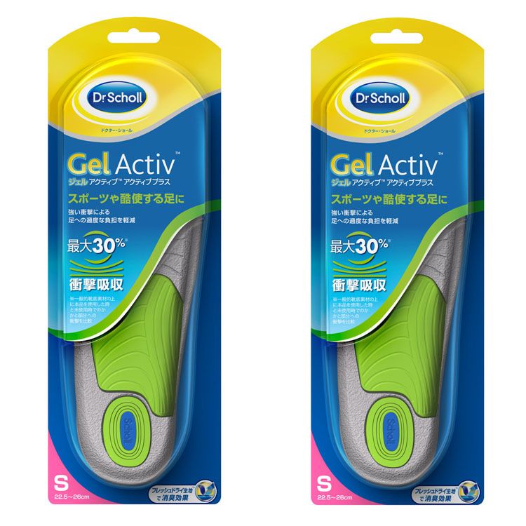 ※リニューアルに伴いパッケージ・内容等予告なく変更する場合がございます。 予めご了承ください。 スポーツ時や酷使する足に、強い衝撃による足への過度な負担を軽減(*1)します。 かかと、膝、足首への衝撃を軽減するために最大30%の衝撃吸収(*2)。 人間工学に基づく軽量設計で、GelActivテクノロジーで優れたクッション性と衝撃吸収効果を実現しました。 フレッシュドライ生地で、さらさらドライ感をキープ。 ランニングシューズ、スポーツシューズ、カジュアルシューズに使用できます。 足底の圧力データを元にフットケアの専門家と共同開発したインソール形状、サイズにあわせてカットすればピタッとフィットします。 *1インソール未使用時と比べて*2一般的靴底素材の上に本品を使用した時と未使用時でのかかと部分への衝撃を比較●セット内容:1足分(2枚入)●商品サイズ(cm):幅約10.4×奥行約2.9×高さ約29.9(Sサイズ/22.5〜26cm)●商品重量:約131g●原産国:ベトナム●ご使用上の注意:パッケージ内側にある使用方法をよくご確認の上、ご使用下さい。 ★関連商品はこちら★★[2個セット]ドクターショール ジェルアクティブアクティブプラス Sサイズ★ドクターショール ジェルアクティブアクティブプラス Mサイズ★[2個セット]ドクターショール ジェルアクティブアクティブプラス Mサイズ(検索用:ドクターショール インソール 消臭 通気性 衝撃軽減 ジェルインソール 靴擦れ 足・膝のトラブル スポーツ クッション 4906156401813) 最強翌日配送対象商品に関するご案内 最強翌日配送対象商品・対象地域に該当する場合は最強翌日配送マークがご注文カゴ近くに表示されます。 最強翌日配送可能なお支払方法は【クレジットカード、代金引換、全額ポイント支払い】のみとなります。 下記の場合は最強翌日配送対象外となります。 ・15点以上ご購入いただいた場合 ・時間指定がある場合 ・ご注文時備考欄にご記入がある場合 ・決済処理にお時間を頂戴する場合 ・郵便番号や住所に誤りがある場合 ・最強翌日配送対象外の商品とご一緒にご注文いただいた場合 ・お届け先住所文字数が40文字以上の場合 ドクターショール ジェルアクティブアクティブプラス Sサイズドクターショール インソール 消臭 通気性 衝撃軽減 ジェルインソール 靴擦れ 足・膝のトラブル スポーツ クッション レキットベンキーザー 2,051 ~