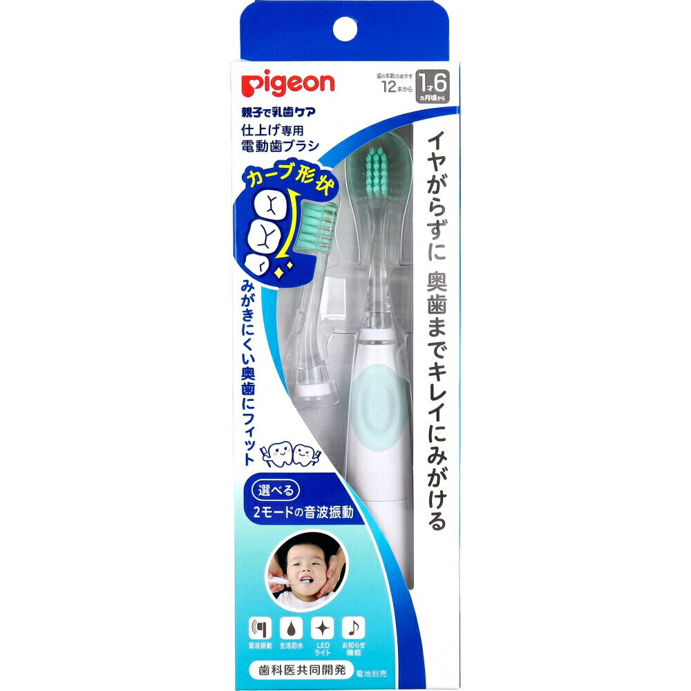 ■商品紹介商品番号:ns-ki-4902508275217手早く、しっかりと汚れが落とせる。 ●お子さまに合わせて使い分け「2種類の振動モード」・はじめての「ソフトモード」:電動歯ブラシに慣れていないとき。 弱めの振動で歯や歯ぐきにやさしい。 ・慣れたら「しっかりモード」:電動歯ブラシに慣れてきたとき。 適度な振動でしっかり汚れを落とす。 ●みがきにくい奥歯にフィット。 1才6ヵ月頃から(歯の本数の目安:12本から)みがきにくい奥歯にフィットする「カーブブラシ」●お口の中を明るく照らし、すみずみまでみがけるLEDライト。 ●生活防水:IPX7。 ●小さなお口にぴったり薄型ヘッド。 ●みがきやすい角度のカーブネック。 ●しっかり握りやすい滑り止めつきグリップ。 ●音と振動の「お知らせ機能」30秒ごとに音と振動で時間をお知らせし、2分後に自動停止。 ●衛生的に立てて保管できる底面フラット形状。 【セット内容】・電動歯ブラシ本体×1個・ブラシ(6ヵ月頃から)×2個・取扱説明書(保証書付き)×1部【仕様】・電源:単4形アルカリ乾電池1本(別売)・本体サイズ:最大外径約22mm×全高約162mm・振動数:はじめての「ソフトモード」約12000回/分(無負荷時)、慣れたら「しっかりモード」約16000回/分(無負荷時)・防水性:IPX7(生活防水)※この電動歯ブラシは「音波振動アシストブラシ」です。 【材質】・本体:ABSなど・仕上げ用ブラシ:飽和ポリエステル/熱可塑性エラストマー・毛:ナイロン/毛のかたさ(やわらかめ)【耐熱温度】60度(仕上げ用ブラシ)煮沸/スチーム・薬液・電子レンジによる消毒・除菌はできません。 【仕上げ用ブラシのお取り替えについて】仕上げ用ブラシは消耗品です。 毛先が広がったり、ブラシ部の汚れが目立ってきたら仕上げ用ブラシの交換をしてください。 【取扱い上の注意】・ご使用前に必ず取扱説明書をよくお読みになり、正しくお使いください。 ・お子様の手の届かないところに保管してください。 お子様には持たせないでください。 ・手みがきと同じように、ブラシを動かしながら磨いてください。 ■サイズ・容量・規格個装サイズ:75X228X30mm個装重量:約71g内容量:1セット製造国:中国【発売元:ピジョン株式会社】■注意事項■こちらの商品はメーカー直送品となります。 ■メーカーに在庫が無い場合はキャンセルさせていただくことがございます。 ■お客様ご都合による返品・交換は出来ませんのでご注意ください■北海道、沖縄、離島については別途送料が掛かります。