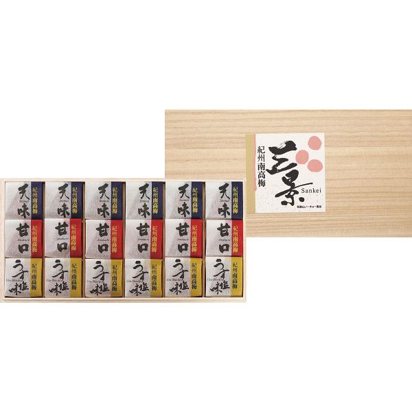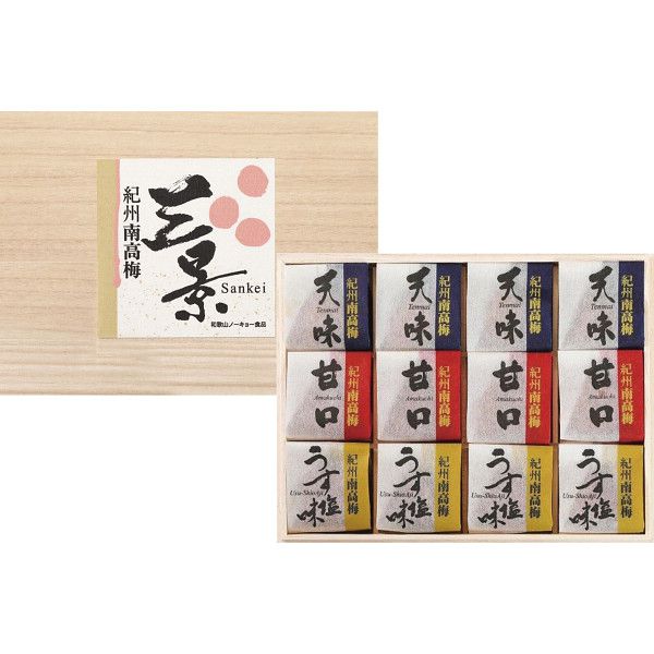 こちらの商品の包装(ラッピング)について○ラッピング・のし承ります(有料)。 のし名入れはご注文時備考欄にご記載下さい。 注文者名とお届け先名が異なる場合は「(注文者名)様ご依頼分」と送り状に記載して発送いたします。 和歌山県産の紀州南高梅の中でも20g以上の大粒の梅干を個包装にし、一粒ずつ丁寧に高級感のある木箱に詰合せました。 それぞれ味わいの異なる3種類の梅干を是非食べ比べください。 大切な人、大切な日のプレゼントに最適です。 【商品内容】●甘口はちみつ梅干(塩分約6%)・天味梅干(塩分約4%)・うす塩味梅干(塩分約6%)×各4【原産国】日本【箱サイズ】22.7×17.5×4.8cm【箱入重量】420g【宅配区分】常温【賞味期間】365日[ 梅干し セット 詰め合わせ ギフト ] 【ギフト】紀州南高梅 三景12粒 【北海道・沖縄・離島配送不可】 3,135 ~