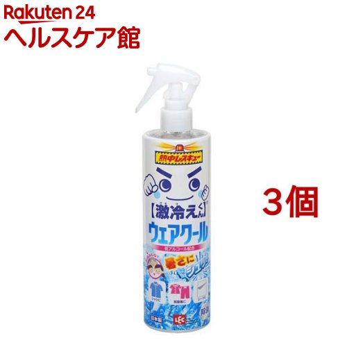 お店TOP>衛生医療>冷却用品(冷却用具)>冷却スプレー>冷却スプレー 衣類用>熱中レスキュー ウェアクール (400ml*3個セット)【熱中レスキュー ウェアクールの商品詳細】●「激落ちくん」が激冷やす!涼しさが長持ちする衣類・布用の冷感スプレーです。 ●衣類にスプレーするだけで、汗をかくとひんやり涼しく気持ち良いです。 ●冷感持続剤配合で汗がひいた後も気持ち良い冷感が続きます。 ●通勤・通学などの外出前にシャツなどの衣類に使用すると、屋外でも涼しく快適に過ごせます。 ●衣類についた汗のニオイ菌を除菌※し、消臭します。 ※ただしすべての菌を除去するわけではありません。 ●「ウェアクール」は外出前の服にはもちろん、屋内で暑さを感じるときにふとんや衣服にもご使用いただけるスプレーです。 ●かけすぎ防止のコンパクトヘッド仕様です。 ●低アルコール処方!お年寄りやお子様でもご利用いただけます。 ●たっぷり400mlの大容量。 約1300プッシュご使用いただけます。 ●爽やかなミントの香り。 【成分】主成分:エタノール、l-メントール他【規格概要】・商品サイズ:約幅6cm*奥行6cm*高さ21.5cm・内容量:400ml【注意事項】★使用上の注意・火気の近くで使用しない。 (火気は衣類が完全に乾いてから使用する。 )・火気を使用している室内で大量に使用しない。 ・車内など風通しの悪い空間では使用しない。 室内で使用する場合は換気をする。 ・本品は衣類・布類専用なので、肌に直接使用しない。 ・衣類が汚れていたり、シミがついていると輪ジミになる可能性があるので、付着物をあらかじめ除去してから使用する。 ・肌の弱い方はあらかじめ少量で試し、肌に異常がないことを確認し使用する。 ・皮フに異常(傷口、やけど、日焼けによる熱傷など)がある部位にあたる箇所には使用しない。 ・直接肌に触れる場所にスプレーする際は、回数を減らすなど調整する。 ・肌に合わない場合には、使用を中止する。 ・皮フの薄い部分や粘膜に触れる衣類には使用しない。 ・床、テーブル、プラスチック(樹脂製品)についた場合には変色することがあるのですぐに拭き取る。 ・用途以外に使用しない。 ・廃棄の際は、使い切ってから捨てる。 ・逆さまでは使用しない。 ・目に入った場合は、こすらず、すぐに流水で充分に洗い流す。 ・誤って口に入れた場合は、大量の水を飲むなど対処する。 ・皮フについた場合は、石けんと水で充分に洗い流す。 ・いずれの場合も異常のある場合は、本製品を持参し医師に相談する。 ・使用後は必ずストッパーを元の位置まで戻し、閉じた状態にする。 ★保管及び取り扱いの注意・小さなお子さまの手の届かないところに保管する。 ・車内、直射日光のあたる場所を避け、涼しい場所に保管する。 ・しばらく使用しない場合は、必ずストッパーを元の位置まで戻し、閉じた状態にする。 【原産国】日本【ブランド】レック【発売元、製造元、輸入元又は販売元】レック※説明文は単品の内容です。 商品に関するお電話でのお問合せは、下記までお願いいたします。 受付時間:平日9:00‐16:00レック 03-3527-2650バルサン 03-6661-9941リニューアルに伴い、パッケージ・内容等予告なく変更する場合がございます。 予めご了承ください。 ・単品JAN:4573177594987レック104-0031 東京都中央区京橋2-1-3 京橋トラストタワー8F ※お問合せ番号は商品詳細参照広告文責:楽天グループ株式会社電話:050-5577-5043[冷却用品/ブランド:レック/] 熱中レスキュー ウェアクール(400ml*3個セット)【レック】 3,039 ~
