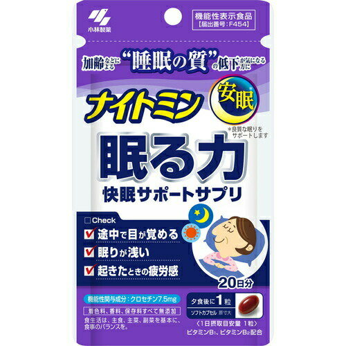 広告文責・販売事業者名:株式会社ビューティーサイエンスTEL 050-5536-7827・・・・・ 商 品 詳 細 ・・・・・ 商品名 ナイトミン 眠る力 20粒 内容量 20粒 商品詳細 ●睡眠の途中の目覚め(中途覚醒)、加齢などで睡眠の質の低下が気になる方におすすめのサプリメントです。 ●良質な睡眠をサポートするナイトミンブランドのサプリメントです。 ●起きたときに疲労感を感じる方にもおすすめです。 ●機能性関与成分 クロセチン7.5mg ●1日の目安:1粒(夕食後) ●機能性表示機能性表示食品 届出番号:F454 ●届出表示 本品には、クロセチンが含まれます。 クロセチンは、良質な眠りをサポートする(途中覚醒回数を減らし、眠りをより深くし、起床時の眠気や疲労感を和らげる)ことが報告されています。 加齢などによる睡眠の質の低下が気になる方に適しています。 ●本品は、事業者の責任において特定の保健の目的が期待できる旨を表示するものとして、消費者庁長官に届出されたものです。 ただし、特定保健用機能性表示食品と異なり、消費者庁長官による個別審査を受けたものではありません。 【材質・原材料・成分】 クロセチン 備考 ※効果には個人差があります。 すべての方に効果を保証するものではありません。 ※パッケージデザイン等は予告なく変更されることがあります。 ※メーカー都合により商品のリニューアル・変更及び原産国の変更がある場合があります。 区分 機能性表示食品 発売元・販売元 小林製薬 JANコード 4987072061220 ★ポイント10倍[1月24日20時〜25日23:59迄]ナイトミン 眠る力 20粒 1,850 ~