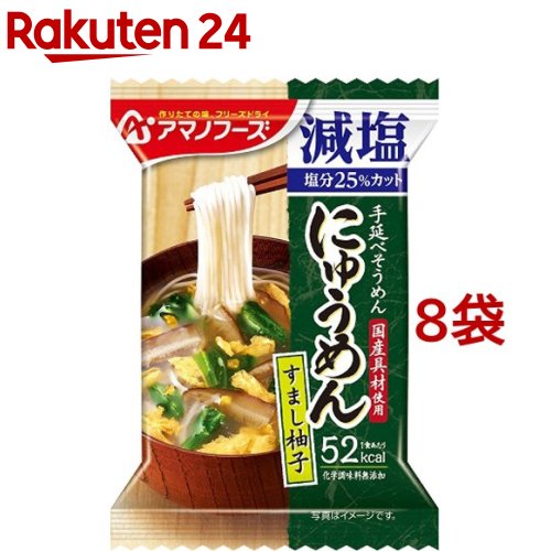 お店TOP>フード>加工食品・惣菜>フリーズドライ食品>フリーズドライ(スープ)>アマノフーズ にゅうめん 減塩すまし柚子 (1食入*8袋セット)【アマノフーズ にゅうめん 減塩すまし柚子の商品詳細】●かつおと昆布、椎茸のだしに、柚子の香りが効いたさっぱりとしたにゅうめんです。 ●具材には、ほうれん草、かき卵、椎茸、柚子入り。 お湯を注ぐとふんわりかき卵とほうれん草がふわっと広がります。 ●当社「にゅうめん すまし柚子」と比べ、1食当たり食塩相当量25%カット。 ●国産手延べ素麺、国産具材使用【召し上がり方】中身をお椀に入れ、熱湯を約180mL注ぎ、麺をよくほぐしてお召し上がりください。 【品名・名称】乾燥にゅうめん【アマノフーズ にゅうめん 減塩すまし柚子の原材料】そうめん(国内製造)、かつお節昆布抽出液、ほうれんそう、液全卵、でん粉、還元水あめ、かつおエキス、みりん、食塩、ゆず果皮、乾燥しいたけ、しょうゆ、発酵調味料、だしの素、酵母エキスパウダー、しいたけエキスパウダー、かつお節粉末、こんぶ粉末、香辛料/酸化防止剤(ビタミンE)、(一部に小麦・卵・大豆を含む)【栄養成分】1食分(12.9g)当りエネルギー:52kcal、たんぱく質:2.1g、脂質:0.4~1.2g、炭水化物:9.0g、食塩相当量:0.71g【アレルギー物質】小麦、卵、大豆【保存方法】高温多湿のところを避け、常温で保存してください。 【注意事項】本品製造工場ではえび・かに・乳成分を含む製品を生産しています。 ・調理時、喫食時の熱湯でのやけどには、十分ご注意ください。 【ブランド】アマノフーズ【発売元、製造元、輸入元又は販売元】アサヒグループ食品※説明文は単品の内容です。 商品に関するお電話でのお問合せは、下記までお願いいたします。 菓子、食品、健康食品、サプリメント、スキンケアなど:0120-630611ミルク、ベビーフード、乳幼児用品専用:0120-889283リニューアルに伴い、パッケージ・内容等予告なく変更する場合がございます。 予めご了承ください。 ・単品JAN:4971334207648アサヒグループ食品130-8602 東京都墨田区吾妻橋1-23-1 アサヒグループ本社ビル ※お問合せ番号は商品詳細参照広告文責:楽天グループ株式会社電話:050-5577-5043[スープ/ブランド:アマノフーズ/] アマノフーズ にゅうめん 減塩すまし柚子(1食入*8袋セット)【アマノフーズ】[フリーズドライ インスタント にゅうめん 柚子] 2,270 ~