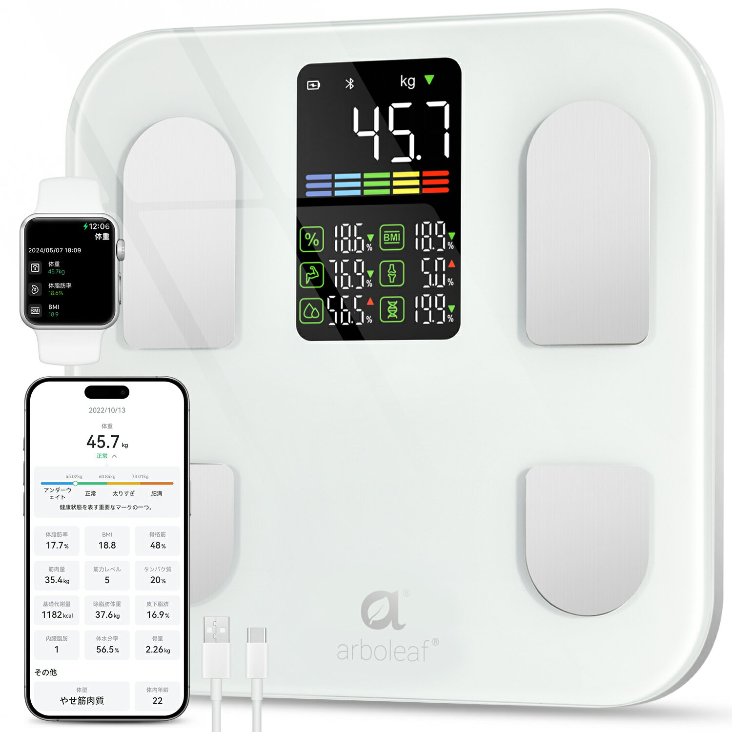 Smart Scale Proについて 製品仕様について ブランド arboleaf 強化ガラス ステンレス鋼 カラー ホワイト 電源 Type-C 充電式 サイズ 28 x 28 x 2.5 cm 重量 約1.3kg 付属品 Smart Scale Pro*1個、Type-c充電ケーブル*1本、 取扱説明書*1冊。 セール期間中について セール期間中は、通常より大変多くのご注文を頂きます。 そのため、在庫確認後のご案内や受注対応が平常時よりも遅れるケースがございます。 大変ご迷惑をお掛け致しますが、ご理解下さいます様お願い申し上げます。 セール商品の価格について 楽天市場の各種セールキャンペーンを参加する商品は予告なく価格の変更を行う場合がございます。 価格変更の詳細は、お問い合わせを頂いてもご返答ができませんのでご了承下さいませ。 購入後に値下げされたので、自分も値下げしてほしい! 楽天市場の各種セールキャンペーンを参加する商品は予告なく価格の変更を行う場合がございますが、 ご購入後の商品の値引き対応はいたしかねます。 ご理解、ご協力をお願い申し上げます。 乗るだけで、カラダのすべてを見える化。 家族みんなの健康習慣に。 【製品概要・アプリ連携】 ・対応OS:iOS / Android 対応。 専用アプリ「Arboleaf」は App Store / Google Play から無料ダウンロード可能。 ・Bluetooth自動接続:体重計に乗るだけでアプリと自動接続し、測定データは自動的にアップロード。 ・連携アプリ:「Apple Health」「Google Fit」「Fitbit」「あすけん」などと連携し、健康データを一元管理可能。 ・登録人数制限なし:家族全員で使用可能。 ユーザーを自動で識別し、それぞれのデータを個別に記録・管理。 【測定性能・技術仕様】 ・測定技術:4つの高精度センサーと最先端BIA(生体電気インピーダンス)技術を搭載。 ・測定誤差:わずか50g?150gの誤差範囲で高精度な測定を実現。 ・対応体重範囲:5kg?150kgまで対応。 子供から大人まで幅広く利用可能。 ・測定条件:正確な測定のために、素足で平らな床に置いて使用してください。 【測定項目・表示機能】 ・アプリで確認できる測定項目: 体重、体脂肪率、BMI、筋肉量、基礎代謝量、水分量、骨量、内臓脂肪、体内年齢、たんぱく質量 など全15種類。 ・体重計本体に表示される項目: 体重、体脂肪率、BMI、筋肉量、体内年齢 などの7つ主要項目を、3.5インチの大画面LEDディスプレイにわかりやすく表示。 数字が大きく、視認性に優れています。 ・ディスプレイ仕様:アプリを開かなくても、体重計本体のみで複数の測定結果をその場で確認可能。 夜間でも使いやすいLEDバックライト付きで、暗い場所でもはっきり見える安心設計です。 ・自動ON/OFF機能:乗るだけで測定スタート、降りると自動で電源オフ。 毎日の使用がスムーズに。 【操作性・デザイン】 ・操作性:アプリと自動連動、初期設定も簡単。 日々の測定がストレスなく行えます。 ・デザイン:シンプルでコンパクトな設計。 収納しやすく、部屋の雰囲気を損ねません。 ・安全性:滑り止めゴム、角の丸い安全設計で安心して使用可能。 ・視認性:LEDバックライト付きディスプレイで暗い場所でも数値がはっきり見えます。 【付属品・品質保証】 ・付属品:体重計本体、Type-C充電ケーブル、取扱説明書。 ・電源仕様:5V / 1.5A または 5V / 2A アダプターでの充電を推奨。 ・保証・サポート:1年間の製品保証(返金・交換対応)+ 24時間以内のサポート返信対応。 ・品質認証:JIS認証、丸正マーク取得済み。 高い信頼性と安全性を確保。