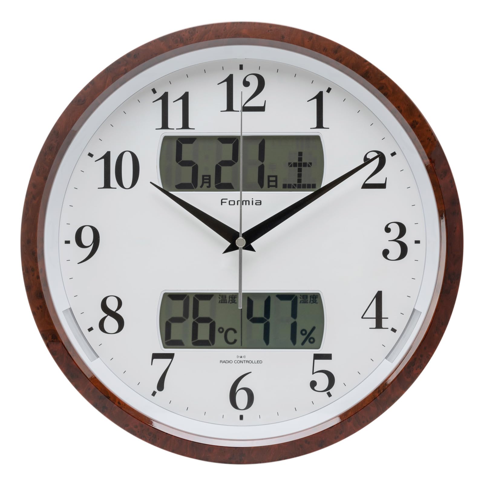 時刻合わせが不要の電波時計。 温度・湿度、カレンダーなど日常生活に便利な情報をデジタル表示夜間は自動的に秒針が止まり音が静か。 リビング・寝室等におすすめ機能・仕様:電波自動受信機能、手動時刻設定機能、秒針停止機能(午後10時から午前6時の間)、ライト自動点灯機能(午後10時から午前6時の間)、ライト明るさ切替(強・弱・切)、温度表示、湿度表示、カレンダー表示、ステップ秒針推奨電池:単3アルカリ乾電池×6(別売)本体サイズ:(約)高さ32.0×幅32.0×奥行き4.7cm時刻合わせが不要の電波時計。 温度・湿度、カレンダーなど日常生活に便利な情報をデジタル表示 夜間は自動的に秒針が止まり音が静か。 リビング・寝室等におすすめ 機能・仕様:電波自動受信機能、手動時刻設定機能、秒針停止機能(午後10時から午前6時の間)、ライト自動点灯機能(午後10時から午前6時の間)、ライト明るさ切替(強・弱・切)、温度表示、湿度表示、カレンダー表示、ステップ秒針 推奨電池:単3アルカリ乾電池×6(別売) 本体サイズ:(約)高さ32.0×幅32.0×奥行き4.7cm 【まとめ買いで最大1000円OFFクーポン!】【送料無料】電波 壁掛け時計 木製 温度 湿度 温湿度計 日付 曜日 夜間秒針停止 静音 夜間自動点灯 アナログ 和室 保土ヶ谷電子販売 ブラウン HWC-016W-BR 8,551 ~