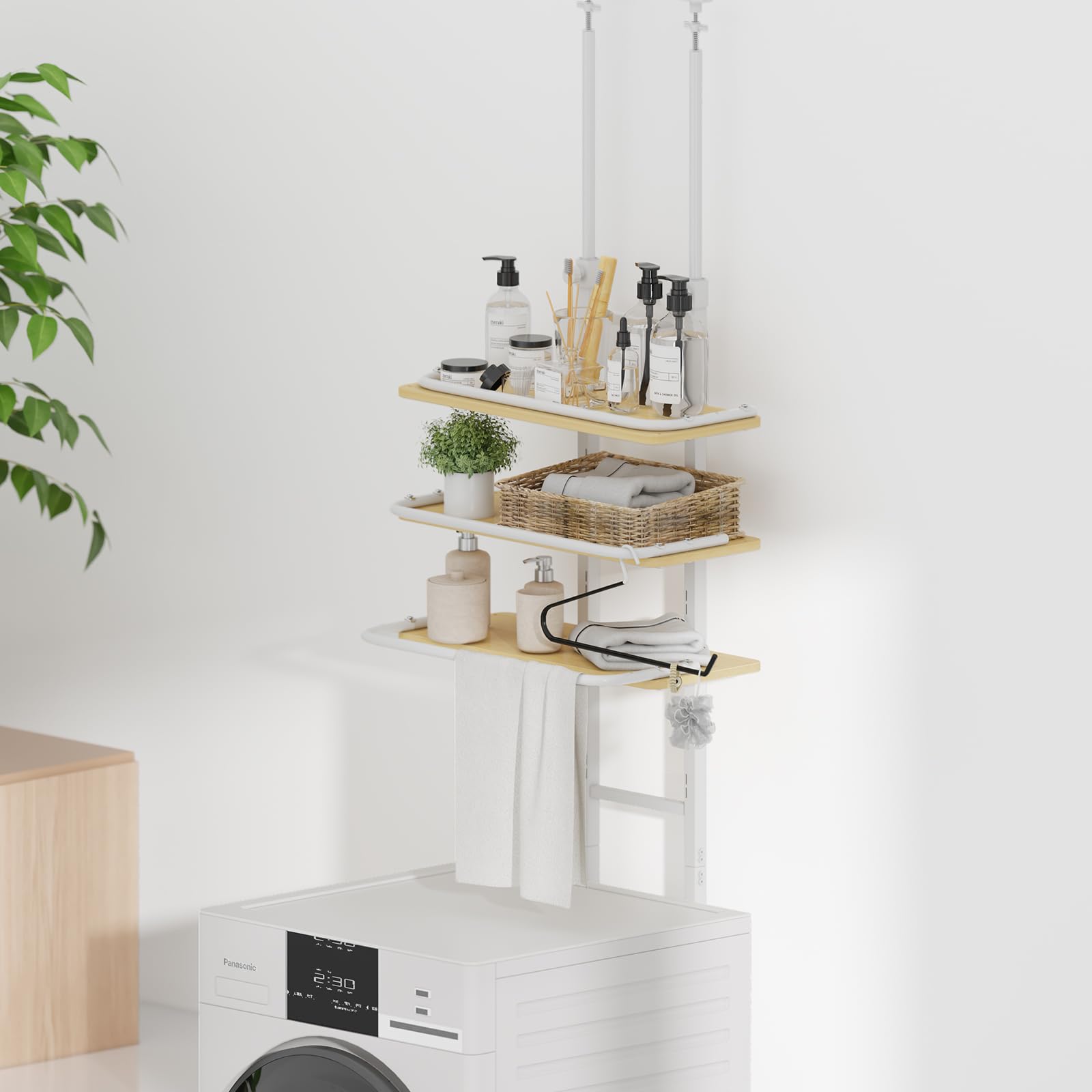 【まとめ買いで最大1000円OFFクーポン!】【送料無料】ランドリーラック 幅60cm奥行き27高さ203〜280cm 棚板8段階高さ調節 掛け場3段階長さ調節 防水パン対応 フェルト付き 洗濯機ラック 突っ張り式 省スペース スリム シャワールーム収納 組み立て簡単 (ナチュラル) 8,827 ~