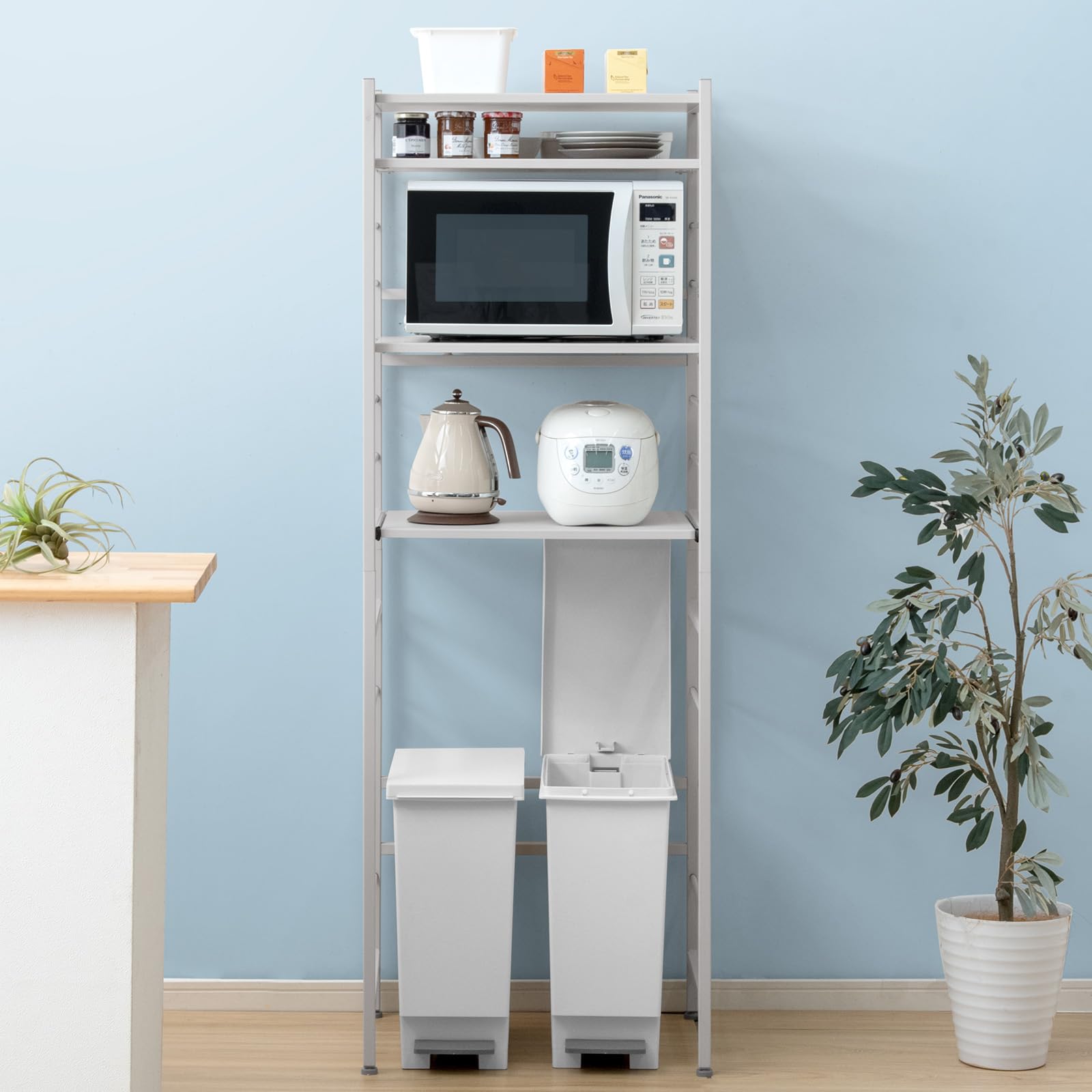 【サイズ】幅60×奥行45×高さ168.5cm【耐荷重】固定棚(最上段):約40kg / 可動棚:約30kg / スライドトレー:約12kg【重量】約20kg【耐熱温度】約60℃【素材】ラック部:スチール(粉体塗装) / 棚板・引き出し:メラミン樹脂化粧繊維板【生産国】中国【梱包サイズ】約14×57×88cm(梱包重量:約22kg)【組立品】【備考】※2024年8月16日、「ライトグレー」のカラー名を「グレージュ」に変更しました。 尚本体の色味に変更はありません。 ※組み立ては必ず2人以上で行って下さい。 ※ご検討の際は、充分サイズの確認をしていただきますようお願い致します。 ※最上段、スライドトレーは、固定棚となっているため位置を変えることはできません。 【スタッフのおすすめポイント】・ゴミ箱上のデッドスペースを有効活用 ・より長く使える高耐荷重設計 ・大型レンジにも対応 ・使い勝手の良い スライドトレー ・熱、キズ、汚れに強いメラミン天板 ・小物掛けとして活用できるサイドフレーム ・収納物の高さに合わせて棚板調節OK! ・フレームはサビに強い粉体塗装仕上げ【サイズ】幅60×奥行45×高さ168.5cm【耐荷重】固定棚(最上段):約40kg / 可動棚:約30kg / スライドトレー:約12kg 【重量】約20kg【耐熱温度】約60℃【素材】ラック部:スチール(粉体塗装) / 棚板・引き出し:メラミン樹脂化粧繊維板 【生産国】中国【梱包サイズ】約14×57×88cm(梱包重量:約22kg)【組立品】 【備考】※2024年8月16日、「ライトグレー」のカラー名を「グレージュ」に変更しました。 尚本体の色味に変更はありません。 ※組み立ては必ず2人以上で行って下さい。 ※ご検討の際は、充分サイズの確認をしていただきますようお願い致します。 ※最上段、スライドトレーは、固定棚となっているため位置を変えることはできません。 【スタッフのおすすめポイント】・ゴミ箱上のデッドスペースを有効活用 ・より長く使える高耐荷重設計 ・大型レンジにも対応 ・使い勝手の良い スライドトレー ・熱、キズ、汚れに強いメラミン天板 ・小物掛けとして活用できるサイドフレーム ・収納物の高さに合わせて棚板調節OK! ・フレームはサビに強い粉体塗装仕上げ 【まとめ買いで最大1000円OFFクーポン!】【送料無料】キッチンラック 幅60 大型電子レンジ対応 高さ調節可能 スライド棚 フック式 高耐荷重 スリム 頑丈設計 45400101(88137) 12,998 ~