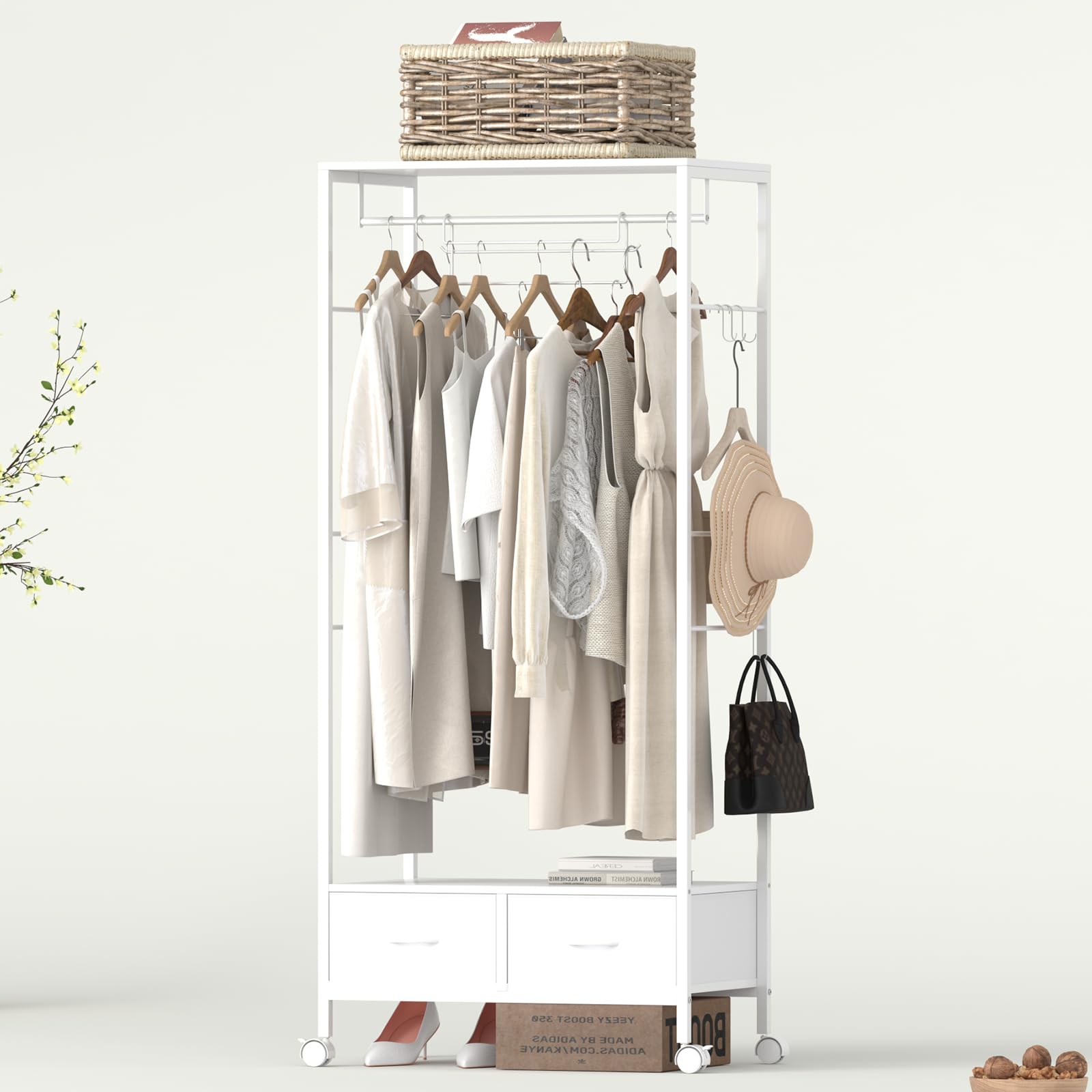 【まとめ買いで最大1000円OFFクーポン!】【送料無料】スリムハンガーラック 幅70奥行き42高さ160cm 総耐荷重80kg ロング丈の服を収納 移動式/固定式2WAY 引き出し2個付き 耐震転倒防止パーツ付き 組立簡単 おしゃれ収納 クローゼット ワードローブ (ホワイト) 8,827 ~