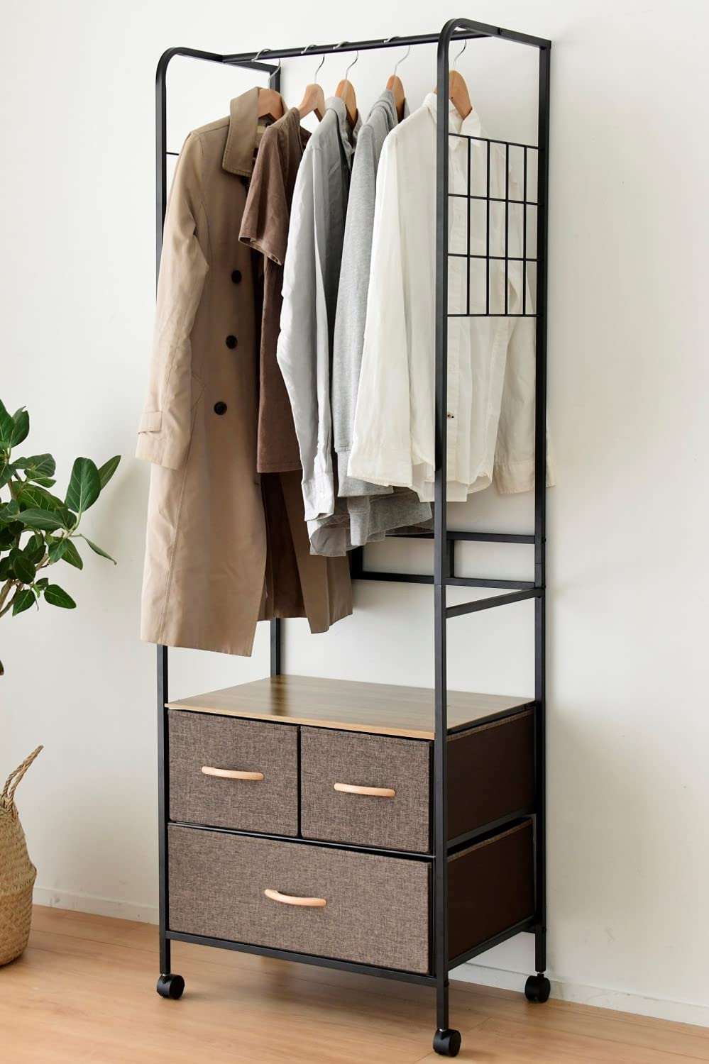 【サイズ】本体:幅58×奥行39×高さ175cm、床~下段棚:11.5cm、引き出し(大)内寸:幅53.5X奥行36.5X高さ18cm、引き出し(小)内寸:幅26.5X奥行36.5X高さ18cm【耐荷重】ハンガーバー:15kg、引き出し(大):10kg、引き出し(小):5kg、天板:10【材質】フレーム:金属(スチール)、棚板:合成樹脂化粧繊維版(メラミン樹脂)、引き出し:ポリエステル、取っ手:天然木、キャスター/:ポリプロピレン●東証プライム(株)山善で扱うすべての山善商品は、自社もしくは第三者機関において、JIS規格に基づいた品質試験を行っております。 【カンタン組立て】お客様組立品※付属工具にて組立て可能【サイズ】本体:幅58×奥行39×高さ175cm、床~下段棚:11.5cm、引き出し(大)内寸:幅53.5X奥行36.5X高さ18cm、引き出し(小)内寸:幅26.5X奥行36.5X高さ18cm 【耐荷重】ハンガーバー:15kg、引き出し(大):10kg、引き出し(小):5kg、天板:10 【材質】フレーム:金属(スチール)、棚板:合成樹脂化粧繊維版(メラミン樹脂)、引き出し:ポリエステル、取っ手:天然木、キャスター/:ポリプロピレン ●東証プライム(株)山善で扱うすべての山善商品は、自社もしくは第三者機関において、JIS規格に基づいた品質試験を行っております。 【カンタン組立て】お客様組立品※付属工具にて組立て可能 【まとめ買いで最大1000円OFFクーポン!】【送料無料】ハンガーラック スリム (キャスター付き) ロボット掃除機が通れる 引き出し付き 幅58×奥行39×高さ175cm 衣類収納 組立てカンタン ブラウン AZFH-6018DX(BR) 11,583 ~