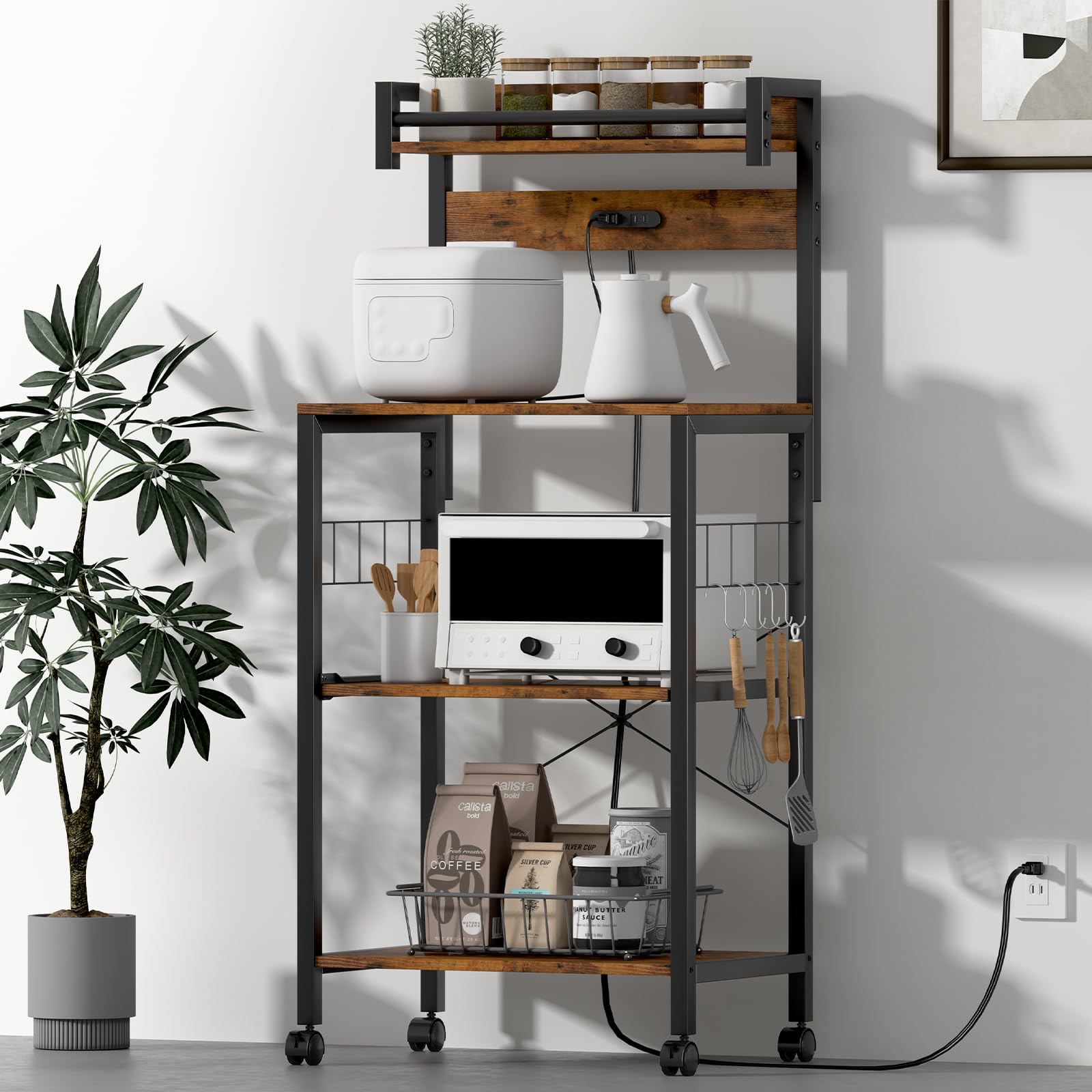 【まとめ買いで最大1000円OFFクーポン!】【送料無料】幅 57 奥行 39.2 高 133cm キッチン収納ラック フック・キャスター付き 5色展開 エポキシ×メラミン素材 耐熱・耐汚性 レンジ上収納+サイド小物整理 2口コンセント付き 多目的キッチン棚 (ヴィンテージ 570幅) 9,087 ~