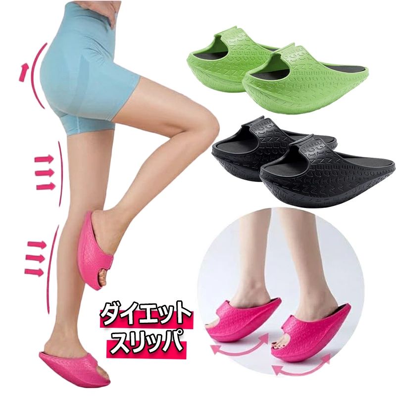 【製品仕様】S:22cm~23cm Mサイズ:23.5~24.5cm素材:EVA【ながらトレーニングで美脚へ】 おうちのスリッパをダイエットサンダルに変えるだけで、キュッと引き締まった美脚へ!ソールに傾斜のあるデザインのため、体が自然とバランスを取ろうとする働きによって無意識に脚に力がかかり、体幹トレーニング、姿勢矯正、脚痩せ、ヒップアップなどの効果が期待できます。 家事をしているときや、オフィスや在宅ワーク中など『ながらトレーニング』だから続けられる!【30°の傾斜が足全体に効く】 約30°の傾斜があるソールによって、無意識のうちにふくらはぎがストレッチされ、下腹やヒップなど普段使われていない筋肉にもしっかりアプローチ。 エクササイズのために新たに時間を作る必要もなく、ただスリッパを履いて歩くだけで簡単にトレーニングを始められます。 【軽量&抗菌防臭】 耐久性とクッション性に優れたEVA素材を採用。 インソールはメッシュ素材なので蒸れにくく、丸洗いも可能でいつも清潔に保てます。 片足約140gと軽量で滑りにくく、長時間履いても快適。 【ご使用上の注意】・ソールが不安定なため、歩きづらかったり、脱げやすかったりします。 慣れるまではゆっくりと慎重に歩いてください。 ・階段や斜面など、転倒の恐れのある場所では使用しないでください。 また重たいものを持っての使用は、バランスを崩しやすいので絶対にしないでください。 ・小さなお子さまの使用はおやめください。 ・本品は、室内用です。 外出時のご使用はお避けください。 ・火気に近づけないでください。 ・効果や使用感には個人差があります。 ※備考※商品写真は、できる限り現品を再現するように画像処理などの補正を行っておりますが、ご利用のモニターや環境により差異が生じます。 予めご了承ください。 ※サイズ詳細等の測り方はスタッフ間で統一、徹底はしておりますが、実寸は商品によって若干の誤差(1cm〜3cm )がある場合がございますので、予めご了承ください。