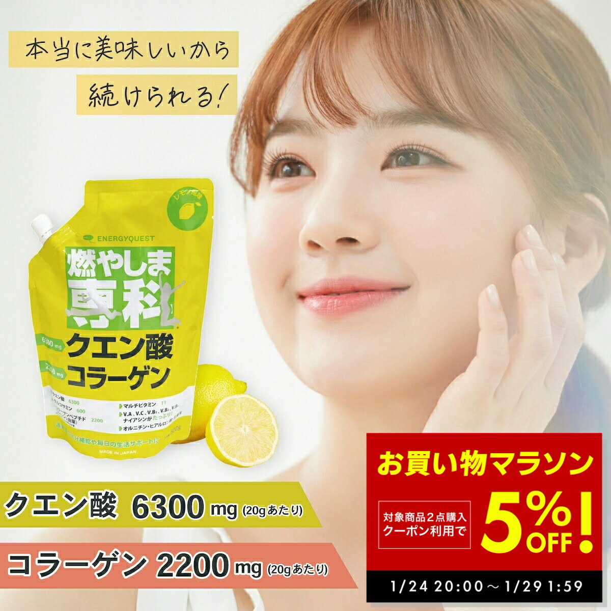 P最大48倍&MAX70%OFF!!お買い物マラソン開催! オススメ商品/ SALE関連ページ 燃やしませんか スポーツジムで人気のスポーツドリンク口コミでも人気急増!!内容量:500g製造国:日本【使用上の注意】本品は吸湿しやすいので、開封後はお早めにご使用ください。 溶かした後は冷蔵庫にて保存し、お早めにお飲みください。 溶かしたり保存したりする場合は、金属以外の容器をご使用ください。 体質・体調により、まれに合わない場合がございますが、そのような時はご利用をお控えください。 疾病等で治療中の方、お薬を飲んでいる方、妊娠している方はご利用になる前に医師にご相談ください。 【原材料名】グラニュー糖(国内製造)、フィッシュコラーゲンペプチド(ゼラチン)、ぶどう糖、食塩、食物繊維、オルニチン、ショウガ末、果糖、レモン果汁、酵母(亜鉛、マンガン、銅、ヨウ素、セレン、クロム、モリブデン含有)/クエン酸、乳酸カルシウム、グルコサミン、香料、甘味料(酵素処理ステビア)、微粒二酸化ケイ素、V.C、塩化K、ナイアシン、V.E、V.B2、パントテン酸Ca、V.B1、V.B6、ヒアルロン酸、V.A、葉酸、V.B12、V.D3【販売元】株式会社エナジークエスト 【2点購入5%OFFクーポン! 1/24 20:00〜 】燃やしま専科 500g レモン風味 スポーツドリンク 粉末 パウダー 粉 クエン酸 ドリンク ダイエット サプリメント マルチビタミン 500ml 送料無料 5,490 ~