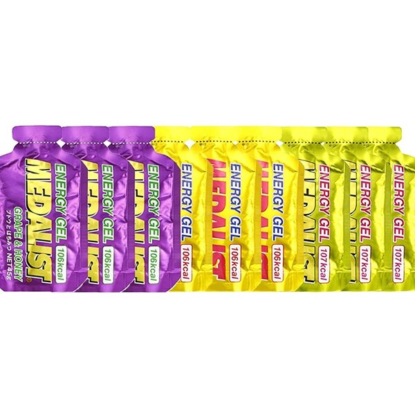 商品名アリスト メダリスト エナジージェル アソートセット 各3個×3種類(9袋)説明持久系スポーツに!エネルギー補給ジェル美味しく、高エネルギーの天然系ジェル●圧倒的食べやすさの超濃縮ジェルはちみつの優しい甘さと天然系成分で、美味しく高エネルギーが補給できます。 天然系素材を使っているので胃が動かなくなるレース後半でも抵抗なく入ります。 ●ベタつかない半固形ゼリーとジェルの中間くらいの程よい食感です。 咀嚼効果(噛む事)で満足感と素早いエネルギー効果も得られます。 また、口の中でベタつきもなく補給する事が出来ます。 ●携帯しやすい小型パウチ携帯に便利な薄型設計で、マラソン・トレラン・登山・自転車競技などポケットやポーチに入れてもかさばりにくいです。 ウルトラマラソンランナー 岩本能史 氏プロデュース!【お召し上がり方】上部の口部分をしっかり持ち、矢印方向にゆっくりと点線に沿ってお切りください。 吸い込まずに最後まで押し出してお召し上がりください。 【おすすめ摂取タイミング】スタート30分前、レース中約1時間に1本を目安に。 ・グレープフルーツとはちみつグレープフルーツの酸味と甘味ですっきり【原材料】果糖、グレープフルーツ果汁、はちみつ、クエン酸Na、増粘多糖類、クエン酸【栄養成分表示】エネルギー...107 kcalたんぱく質...0.3 g脂質...0 g炭水化物...26.4 g食塩相当量...0.23 g・リンゴとはちみつみんな大好き定番のフレーバー【原材料】果糖、リンゴ果汁、はちみつ、クエン酸Na、増粘多糖類、クエン酸【栄養成分表示】エネルギー...106 kcalたんぱく質...0 g脂質...0 g炭水化物...26.6 g食塩相当量...0.21 g・ブドウとはちみつ濃厚なブドウのフルーティーな美味しさ【原材料】果糖、ブドウ果汁、はちみつ、クエン酸Na、増粘多糖類、クエン酸【栄養成分表示】エネルギー...106 kcalたんぱく質...0.1 g脂質...0 g炭水化物...26.3 g食塩相当量...0.20 g・コーヒーとはちみつオトナのコーヒーゼリー風カフェインで集中力アップ【原材料】果糖、コーヒーエキス、蜂蜜/クエン酸Na、増粘多糖類、クエン酸【栄養成分表示】エネルギー...105 kcalたんぱく質...0.1 g脂質...0.1 g炭水化物...26.3 g食塩相当量...0.27 gカフェイン...50 mg※ 原材料をご確認のうえ、食品アレルギーが心配な方は、ご使用をお控えください。 ※ 体質や体調によってまれに身体に合わない場合があります。 異常を感じましたらご使用を中止してください。 ※ 本品は、はちみつを使用しています。 1歳未満の乳児には与えないでください。 ※ 薬を服用、もしくは通院中の方は、お医者様にご相談のうえ、お召し上がりください。 この商品について 必ずご確認ください配送についてメール便での配送になります。 →ご利用の際は必ずお読みください 送料について ご注文合計額が¥1000 (税込)以上で、全国一律『送料無料』です。 →詳細はこちら返品→返品・交換・キャンセルについて※メール便は、日時指定、代金引換、ギフトラッピング・熨斗サービスに対応しておりません。