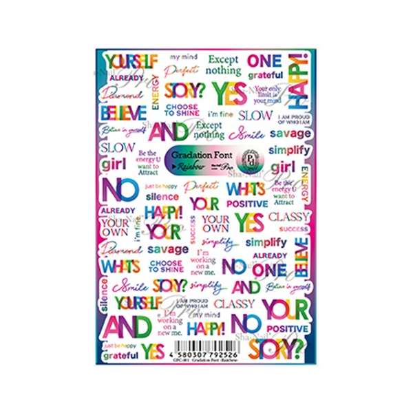 グラデーションフォント レインボーグラデーションフォントのCHiHO先生監修のカラー版!ワンシートに様々なカラーのグラデーションが入った、華のあるフォントデザイン。 存在感のあるカラフル文字は、貼るだけでアートが引き締まるお洒落なモチーフ。 85mm×123mmグラデーションフォント レインボーグラデーションフォントのCHiHO先生監修のカラー版!ワンシートに様々なカラーのグラデーションが入った、華のあるフォントデザイン。 存在感のあるカラフル文字は、貼るだけでアートが引き締まるお洒落なモチーフ。 85mm×123mm