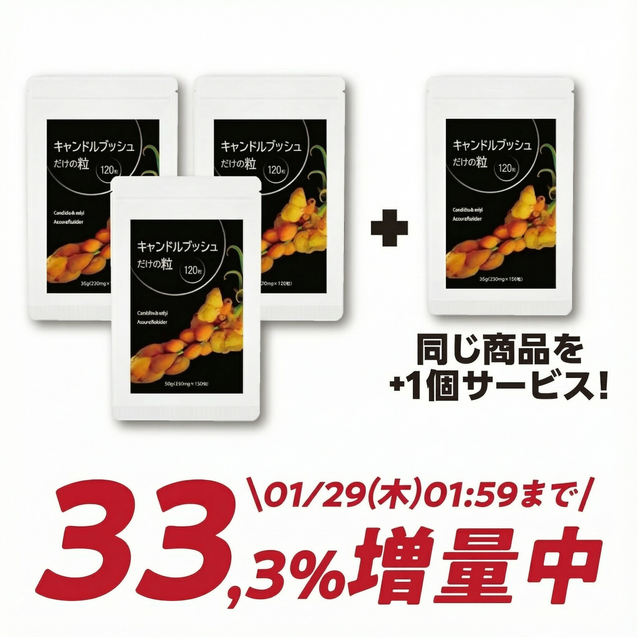 商品詳細 ◆商品名 キャンドルブッシュ だけの粒 120粒 ◆名称 キャンドルブッシュ含有加工食品 ◆原材料名 キャンドルブッシュ ◆内容量 30g(250mg×120粒)×3袋 ◆保存方法 直射日光、高温多湿を避けて冷暗所に保存してください。 ◆販売者 ナチュラルレインボー株式会社 ◆栄養成分表示 1粒(0.25g)あたり エネルギー/0.71kcal たんぱく質/0.04g 脂質/0.01g 炭水化物/0.16g 食塩相当量/0g ◆お召し上がり方 1日あたり1〜10粒を目安にお召し上がり下さい。 かまずに水やぬるま湯などでお飲み下さい。 ◆ご注意 ●原材料表示をご確認のうえ食物アレルギーのある方はお召し上がりにならないでください。 ●原材料に天然物由来成分を使用しているため、色・におい・味などにばらつきが生じる場合があります。 ●体質やその日の体調によりまれに合わない場合があります。 その場合は使用を中止してください。 ●妊娠中・授乳中、またお薬を服用中・通院中の方は医師・薬剤師にご相談のうえご利用ください。 ●保存は高温多湿を避け、開封後はキャップをしっかり閉めてお早めにお召し上がりください。 ●お子様の手の届かないところに保管してください。 ●1日の目安量を基準に過剰摂取にならないようご注意ください。 ●本品の製造設備は、乳、小麦、卵、落花生、えび、かに、豚及び表示を奨励されるアレルギー物質を原材料とした製品にも使用しています。 ●袋に使用している写真・イラストはイメージです。 ◆広告文責 株式会社シーディ 048-924-3981 ◆商品区分 健康食品 増量中!\お値段そのまま4個お届け/【3個】『キャンドルブッシュ だけの粒 120粒』 2,500 ~