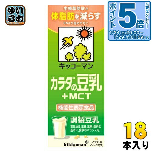 > こちらの商品の単品・まとめ買いはこちら【一個あたり 156円(税込)】【賞味期間】製造後180日【商品説明】・大豆由来の植物性たんぱくと、体脂肪を減らす効果が期待できるMCTを摂ることができる・大豆の青臭さを抑えたまろやかで飲みやすい豆【広告文責】 株式会社ナカヱ 050-3786-3286【メーカー名】 キッコーマン食品株式会社【製造国】 日本製【商品区分】 機能性表示食品【名称および品名】調整豆乳【エネルギー】1本あたり114kcal【栄養成分】たんぱく質6.9g、脂質8.2g、炭水化物3.1g、食塩相当量0.36g、カリウム335mg、カルシウム104mg、マグネシウム42mg、鉄0.86mg【原材料】大豆(カナダ又はアメリカ)(分別生産流通管理済み)、中鎖脂肪酸油、天日塩/乳酸カルシウム、乳化剤、糊料(カラギナン)、香料【保存方法】常温【製造者、販売者、又は輸入者】キッコーマン食品株式会社【アレルギー特定原材料】大豆※北海道・沖縄県・離島(一部)へのお届けは決済時に送料無料となっていても追加送料が必要です。 (コカ・コーラ直送を除く)北海道1個口 715円(税込)、沖縄県1個口 2420円(税込)※離島・一部地域は追加送料がかかる場合があります。 追加送料の詳細は注文確定メールにてご案内いたします。 ※本商品はご注文タイミングやご注文内容によっては、購入履歴からのご注文キャンセル、修正を受け付けることができない場合がございます。 変更・修正ができない場合は、メール、お電話にてご連絡をお願い致します。 ■ 法人・団体のお客様 大口購入のご相談承ります ■法人のお客様、各種団体のお客様で、まとまった数量でのご購入をご検討の際は、お気軽にご相談ください。 お客様のご要望に合わせて柔軟に対応させていただきます。 まずはお気軽にお問い合わせフォームよりご連絡ください。 送料無料 BMIが高めの方に 体脂肪を減らす 中鎖脂肪酸 植物性たんぱく飲料 豆乳 とうにゅう 大豆イソフラボン 大豆レシチン 健康 200ミリ Soy Milk kikkoman 分類: 200ml 紙パック (180ml〜250ml) ケース まとめ買い セット 4930726103517 〔エントリーでポイント5倍!〕 キッコーマン 調整豆乳 カラダの豆乳 +MCT 200ml 紙パック 18本入 豆乳飲料 機能性表示食品 体脂肪 BMI 2,799 ~