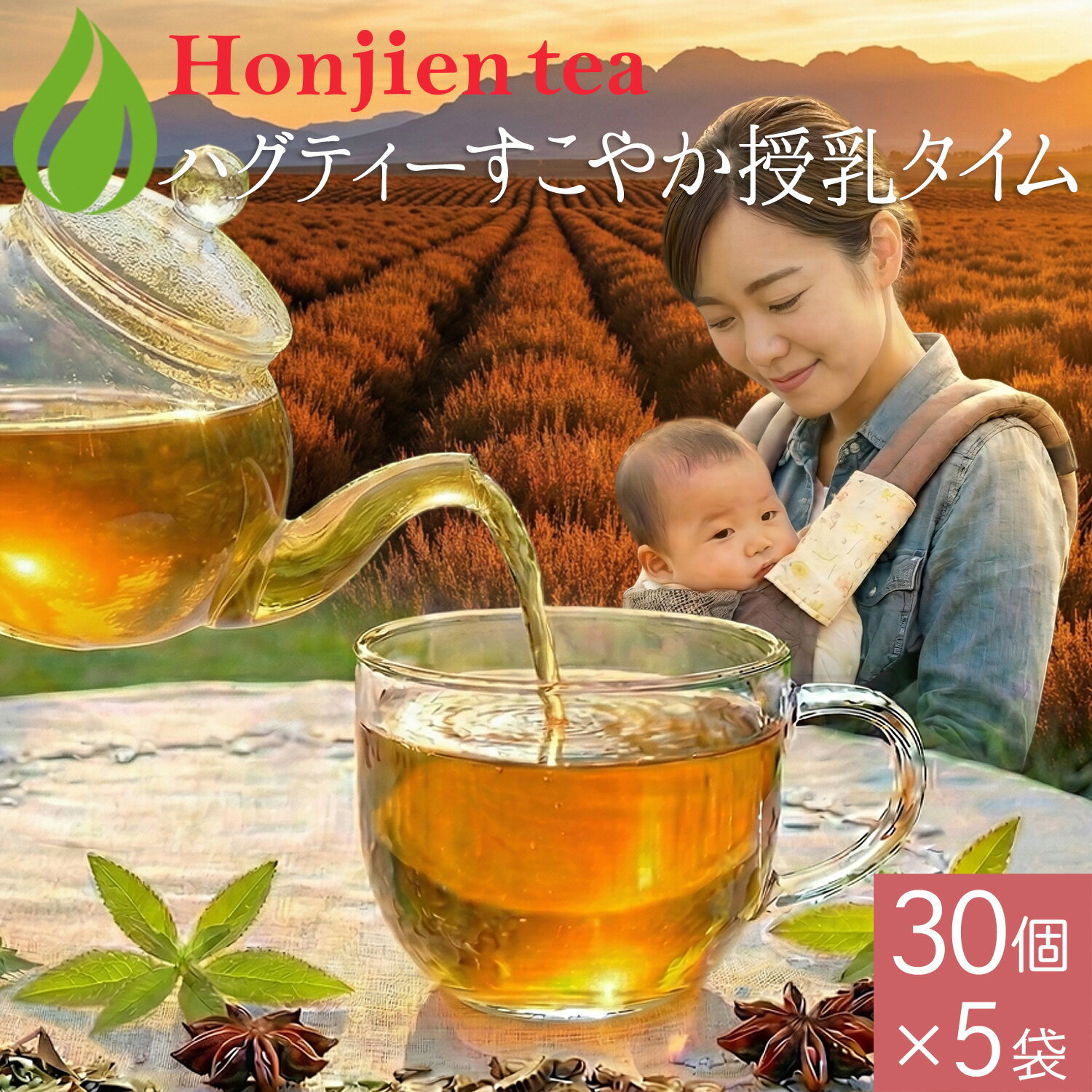 送料無料! ● ハグティー・すこやか授乳タイム 1.6g x 30p( 48g ティーバッグ ) ほんぢ園 < ノンカフェイン ハーブティー 授乳 母乳 育児 産後 ママ ブレンド茶 ごぼう アニス ルイボス 香料 保存料 不使用 > \【国産緑茶でカテキンを摂ろう!】/粉末茶シリーズに新商品が登場!【同一品質でさらにお得に!】通常サイズと大容量サイズの中身は同じものです。 【お届けの目安について】楽天イベント・セールやテレビ放送などでご注文が殺到した場合や、他のモール・店舗でも在庫を共有しているため、目安より納期が遅れたり、在庫切れが起きることがございます。 いずれの場合も当店より正確な発送日をメールにてお知らせいたします。 【クーポン、ポイントアップなど】ほんぢ園のお得なお知らせを見逃さないようにするには? ※ご注文から30分以内であれば、購入履歴からキャンセル手続きが可能です。 【購入履歴】からのキャンセル・変更方法はこちらギフト包装・熨斗・同梱についてはこちら●商品規格 名称:ハーブティー 原材料名:ルイボス(レッド)(南アフリカ)、アニス種子 (スペイン)、コリアンダー (モロッコ)、ストロベリー葉(ブルガリア)、ネトル葉 (ブルガリア)、ゴボウ (日本)、レモングラス (エジプト)、スペアミント (イタリア)、レモンバーベナ (モロッコ) 内容量:480g(1.6g x 30p x 10袋) 保存方法:高温、多湿は避け、移り香に注意 賞味期限:製造から約2年 開封後はお早めにお召し上がりください。 販売者:株式会社ほんぢ園+HK2 岡山市北区表町1-9-49 ●商品説明 【ママを楽しむ、ママを応援する。 授乳期に寄り添うやさしいハーブティー】産後の忙しい毎日を過ごすママのために、ハーブ専門店が開発したオリジナルブレンドティーです。 母乳育児中の水分補給に 古くから女性の健康維持に役立つとして親しまれてきた「ごぼう」と「アニス」を中心にブレンドしました。 授乳期に欠かせないこまめな水分補給をおいしくサポートします。 心ほどけるくつろぎの時間 睡眠不足や忙しさで余裕がなくなりがちな時期だからこそ、自分をいたわる時間は大切です。 ルイボスとレモンバーベナの爽やかな風味で、リフレッシュできる味わいに仕上げました。 カフェインを控えたい授乳期でも気兼ねなくお飲みいただけるノンカフェイン。 穏やかなティータイムで、心安らぐひとときをお過ごしください。 ママと赤ちゃんのための「4つの安心ポイント」 POINT 1:老舗専門店ならではの安心品質 日本初のハーブ専門店として長年培ってきたノウハウを活かし、原料の選定から製造まで徹底した管理を行っています。 POINT 2:香料・保存料・アレルゲン不使用 食品添加物やアレルギー特定原材料等は一切不使用。 素材そのままの風味を活かした、やさしいブレンドです。 。 POINT 3:残留農薬基準・品質検査をクリア 食品衛生法に基づく残留農薬基準を遵守。 さらに水分量や異物検査など、厳しい品質管理のもとで製造しています。 。 POINT 4:「カフェイン検査」実施済み ノンカフェインであることはもちろん、専門機関での検査を実施し、カフェインが含まれていないことを確認しています。 飲み方 カップにティーバッグを入れ、約150mLの熱湯を注ぎます。 ?3分程度、蒸らしてからお召し上がりください。 妊娠期・授乳期は1日あたり1?3杯を目安にお召し上がりください。 ※お好みで濃さなど調整してください。 ティーバッグについて ※テトラ型のティーバッグは、超音波でカット・接着をしていますので、合成接着剤・ホチキスを使用していません。 中身が綺麗に見えるので、抽出の様子を見ることができます。 また、ティーバッグの中で茶葉が動き、香り高く抽出してくれます。 ※ドライハーブは天産物です。 栽培地の環境によって、色や形状が写真と違う場合がございます。 また気候やその他の要因により、価格・原産国が変わる場合がございます。 ※薬を服用中・通院中の方は医師にご相談の上でお召し上がりください。 ●記載事項 広告文責:株式会社ほんぢ園(電話:086-201-6200) 販売者:株式会社ほんぢ園+HK2 区分:健康食品製造国:日本送料無料! ● ハグティー・すこやか授乳タイム 1.6g x 30p( 48g ティーバッグ ) ほんぢ園 < ノンカフェイン ハーブティー 授乳 母乳 育児 産後 ママ ブレンド茶 ごぼう アニス ルイボス 香料 保存料 不使用 > ハグティー・すこやか授乳タイム 1.6g x 30p( ティーバッグ ) ハグティー・マタニティーセレクト( ティーバッグ ) 100円クーポン+ポイント10倍!ハグティー・すこやか授乳タイム 1.6g x 30p x 10袋( 480g ティーバッグ ) ほんぢ園 < ノンカフェイン ハーブティー 授乳 母乳 育児 産後 ママ ブレンド茶 ごぼう アニス ルイボス 香料 保存料 不使用 P10 > 送料無料 /セ/ NEW 100c 17,500 ~