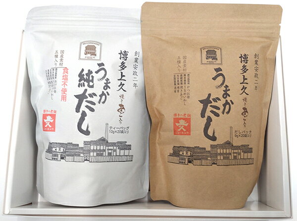 明治屋ストアー推奨品の博多上久のだしの詰合せです。 『博多上久 焼きあご入り うまかだし(だしパック9g×20袋入り)』と、『博多上久 焼きあご入り うまか純だし(ティーバッグ10g×20袋入り)』細かく破砕した五種類の国産原料と調味料をバランスよく配合した、使いやすいティーバッグタイプの本格合わせだし。 九州特産のかつお節、うるめいわし、焼きあごなど、厳選した素材を使用。 有塩と無塩を詰め合わせています。 ● 商品内容 ●【博多上久 焼きあご入り うまかだし(だしパック9g×20袋入り)】★ 原材料名:かつお節(鹿児島県産)、酵母エキス、うるめいわしぶし、でん粉分解物、食塩、焼きあご、昆布、乾しいたけ、粉末しょうゆ、砂糖(原材料の一部に小麦、大豆を含む)【博多上久 焼きあご入り うまか純だし(ティーバッグ10g×20袋入り)】★ 原材料名:かつお節(鹿児島県製造)、うるめいわし、昆布、焼きあご、椎茸○ 配送重量サイズ ○宅60★☆ 配送について ☆★○この商品は、配送エリアによって送料が異なります。 詳しくは、「御利用ガイド」にて宅サイズをご確認下さい。 ○ほかの産地直送商品や工場直送の商品とは同梱できません。 ○ギフト指定がない自宅お届けの場合は、すべて自宅用(本人召し上がり分)として手配させて頂きます。 <こちらのお品物は“贈答用”のお品物となります。 >お品物は、原則“二重包装などはお受けできかねます”何卒ご了承ください。 ★オンラインショップは【自動】で配送料金を加算することが出来ません。 ★ご注文頂きました後に弊社よりお送りする[受注確認メール]にて送料を加算した合計ご請求金額をお知らせする形となります。 何卒ご了承のうえ ご注文頂けますようお願い申し上げます。
