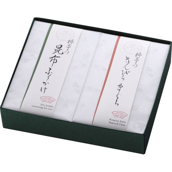 こちらの商品の包装(ラッピング)について○ラッピング・のし承ります(有料)。 のし名入れはご注文時備考欄にご記載下さい。 注文者名とお届け先名が異なる場合は「(注文者名)様ご依頼分」と送り状に記載して発送いたします。 昆布ふりかけ、きんぴらまぐろの2種詰合せです。 場面を選ばないすっきりとしたパッケージでご用意いたしました。 【商品内容】●昆布ふりかけ60g、きんぴらまぐろ120g【箱サイズ】18.5×15.5×4.5cm【箱入重量】302g【宅配区分】常温【賞味期間】120日【アレルゲン】小麦、大豆、ごま[ ギフト ] 【ギフト】料亭のご馳走 二撰 【北海道・沖縄・離島配送不可】 3,142 ~