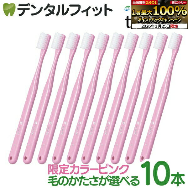 S MS M SS レッド 1本 1本 1本 1本 オレンジ 1本 1本 1本 1本 イエロー 1本 1本 1本 1本 グリーン 1本 1本 1本 1本 ブルー 1本 1本 1本 1本 ホワイト 1本 1本 1本 1本 硬さの説明 ●ソフトブラッシング圧が強い、摩擦の心配がある方に ●ミディアムソフト健康な歯肉と歯をもつ方に ●ミディアムブラッシング圧がコントロールできていて、健康な歯肉の方に ●スーパーソフト歯肉の炎症がある、歯根が露出している方に 【ご注意(免責)事項】当店では、サイト上に最新の商品情報を掲載するよう努めておりますが、メーカーの都合等により、商品規格や仕様(容量・成分・パッケージ・原産国など)が予告なく変更される場合がございます。 このため、実際にお届けする商品と商品ページ上の情報表記が異なる場合がございますので、ご使用前には必ずお届けした商品の商品ラベルや注意書きをご確認ください。 また、商品情報についてページ表記以外の詳細が必要な場合は、メーカー等にお問合せください。 タフト24から限定カラー「ピンク」が登場! ■歯や歯肉を傷つけずに磨けるように毛先が違う 他社製の歯科専用歯ブラシとの違いは、先端を拡大すれば一目瞭然。 1本1本毛先の加工にこだわっています。 歯や歯肉を傷つけることなく汚れを確実に擦掃する形に設計されているので安心。 さらに滅菌されているため、開封時に他社製の拡大画像にあるような細かい汚れや細菌も付着していません。 ■プラークがしっかり落とせる耐久性とコシがあるPBT毛材 PBT毛材(ポリブチレンテレフタレート)は、ナイロン製とくらべて4.2倍も長持ち。 毛先が開きにくく、すぐれた耐久性を持っています。 また、ナイロンは水分を含むとコシがなくなりますが、PBT毛材は水はけがよく開封時と同じ状態を保てます。 コシがしっかりしているので、狙ったプラークをしっかり掃き出すことができます。 ■1束あたりの毛の本数が違います。 1束の毛の密度を高くすることで、歯肉に優しく、より高い擦掃効果を実現しました。 ■シンプルで操作しやすいハンドルと、ムダのないコンパクトなヘッド ストレートで持ちやすいハンドル。 口腔内を上下左右に、自由自在に動かせます。 ヘッドがコンパクトなので、磨きにくい奥歯の奥までヘッドが届きます。 だから、使いやすさにこだわる患者さんがあきずに使い続けてくれます。 ■電子線照射による殺菌処理で安心 「タフト24」に行われている殺菌処理は、WHO(世界保健機関)で安全性が認められています。 【毛の硬さ】 MH(ミディアムハード)…頑固なプラークがつくられている、健康な歯肉の方に M(ミディアム)…ブラッシング圧がコントロールできていて、健康な歯肉の方に MS(ミディアムソフト) …健康な歯肉と歯をもつ方に S(ソフト) …ブラッシング圧が強い、摩擦の心配がある方に SS(スーパーソフト)…歯肉の炎症がある、歯根が露出している方に ESS(エクストラスーパーソフト)…手術後や重度の歯周病の方に 【★エントリーP5倍+先着100円OFFクーポン 1/24 20:00-1/29 01:59】オーラルケア タフト24 歯ブラシ ピンク 10本セット 【数量限定カラー:ピンク】 1,380 ~