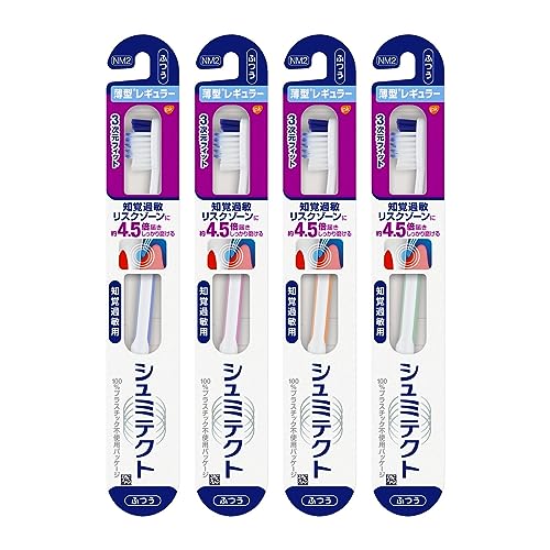 レギュラー4色/4本/-・Size:4本・パッケージ個数:1・独自の弾力ネックで歯グキにやさしい、知覚過敏用歯ブラシ・3次元型植毛で奥歯・歯間・歯面の歯垢をしっかり除去・先端極細毛が歯と歯ぐきのすき間にしっかり届いてクリーニング・奥歯の奥の磨きにくいところまで届いてしっかり磨ける独自の改良薄型ヘッド採用・ロングネックで無理なく奥歯に届く商品紹介 「シュミテクト やさしく歯周ケア3次元フィット ハブラシ」は、 ●弾力ネックで歯グキにやさしい知覚過敏用ハブラシ ●ロングスリムネックで奥歯に届く ●日本市場に合わせて開発された新ハンドル。 短く・持ちやすく改良 ●奥歯の磨きやすさを考えヘッドの薄型化 ●3次元型植毛で奥歯・歯間・歯面の歯垢をしっかり除去。 外側は先端極細シルキー毛、内側は毛先の丸いラウンド毛 ●4色展開(色はお選びいただけません)。 使用上の注意 ネックを過度に曲げると破損する恐れがあります。 毛先が開いたらとりかえましょう。 原材料・成分 柄 白色部・・・ポリプロピレン 着色部・・・SEBS、毛・・・PBT、ナイロン シュミテクトブラシ やさしく歯周ケア3次元フィット 歯ブラシ 知覚過敏ケア 薄型レギュラー (ふつう) 4本 ※色はお選び頂けません 4色 2,455 ~