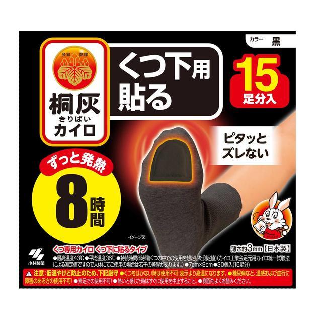 桐灰カイロくつ下用 貼るつま先 黒 商品説明 『桐灰カイロくつ下用 貼るつま先 黒』 ◆くつ下に貼るタイプの足もと用カイロ。 ◆足うらのつま先に貼って使用します。 ◆濃い色のくつ下に目立たず使えます。 ◆最高温度43度 ◆平均温度36度 ◆8時間持続 桐灰カイロくつ下用 貼るつま先 黒 詳細 原材料など 商品名 桐灰カイロくつ下用 貼るつま先 黒 保存方法 ・直射日光をさけ、涼しい所に保存する。 ・小児、認知症の方などの手の届くところに置かない。 内容量 15足分入 販売者 小林製薬 541-0045 大阪府大阪市中央区道修町4-4-10 ご使用方法 ・この説明書きをよく読み、保管しておいてください。 ・使用直前に袋からカイロを取り出し、はく離シートをはがして、もまずに足のつま先裏側にくつ下の上から貼ってすぐにくつを履いてください。 ・くつ下の上からつま先裏側に貼る。 甲側にはらない。 ・開封後残ったカイロはこの袋に入れて保存し早めに使う。 ・保存状態により、表示の持続時間に影響を与えることがある。 ・用途:くつ専用(くつ下に貼るタイプ) ご使用上の注意 ★低温やけど防止のための注意 ・低温やけどは、体温より高い温度の発熱体を長時間あてていると紅斑、水疱等の症状をおこすやけどを言う。 なお、自覚症状をともなわないで低温やけどになる場合もあるので注意する。 ・くつ以外では使用しない。 ・スリッパやサンダル、サイズが大きいくつ等、空気の入りやすい履物では高温になることがあるため使用しない。 ・就寝時は使用しない。 ・他の暖房器具との併用は高温になるため使用しない。 ・足のつま先裏側以外には使用しない。 ・ジョギング等スポーツをするときには使用しない。 ・糖尿病など、温感および血行に障害のある方は使用しない。 ・幼児又は身体の不自由な方など本人の対応が困難な場合は使用しない。 ・熱いと感じた時はすぐにはがす。 ・熱いと感じた時にすぐにははがせない状態での使用はさける。 ・片足に同時に複数枚使用しない。 ・肌の弱い方は特に低温やけどに注意する。 ・肌に直接貼らない。 ・万一やけどの症状があらわれた場合はすぐに使用を中止し、医師に相談する。 ★その他の注意 ・使用後はすぐにはがす。 ・使用後や貼り直しをするときはくつ下などを傷めないようカイロとくつ下の間に指を入れてゆっくりとはがす。 ・歩き方などには個人差があり、使用中カイロが変形して破れ、くつの中を汚すことがあるので注意する。 ・ブーツ等空気の入りにくいくつや、非常に寒い環境下では発熱しにくい場合がある。 ・くつを履いていない状態では高温になり膨らむことがある。 ・用途外には使用しない。 ・小児、認知症の方などの誤食に注意する。 ・使用後は、市区町村の区分に従って捨てる。 ・直射日光をさけ、涼しい所に保存する。 ・小児、認知症の方などの手の届くところに置かない。 原産国 日本 広告文責 株式会社プログレシブクルー072-265-0007 区分 日用品桐灰カイロくつ下用 貼るつま先 黒 15足分入 桐灰カイロくつ下用 貼るつま先 黒(15足分入)【正規品】【k】【ご注文後発送までに2週間前後頂戴する場合がございます】 1,165 ~